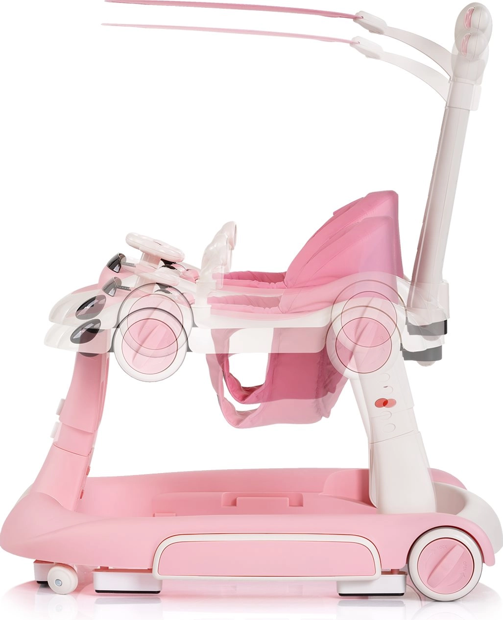 Bébijáró, hintázó mód, ugráló üzemmód, játszóközpont és tolható/odrázós funkció – egy megoldás a fejlődés különböző szakaszaira és a mindennapi szórakozásra.