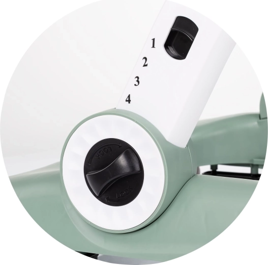 Csúszásgátló betétek, ütközők, rögzíthető kerekek és sebességszabályzás. A magasság könnyen a gyermek növekedéséhez igazítható.