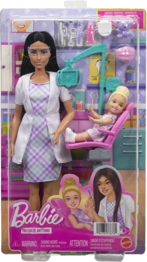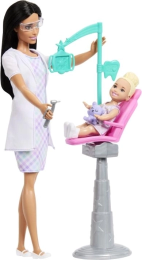 A Barbie fogorvos játékszett a gyerekeket az egészségmegőrzés és a foghigiénia világának felfedezésére inspirálja. A csomag része egy fekete hajú BARBIE baba elegáns ruhában és laboratóriumi köpenyben, egy kis páciens rózsaszín székben, valamint autentikus kiegészítők, mint eszközök, pohár, fogkefe és fogkrém. Az állítható széknek és mozgatható elemeknek köszönhetően a játék maximálisan élethű.