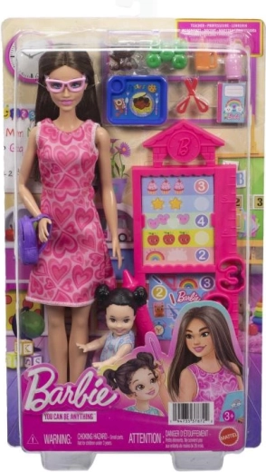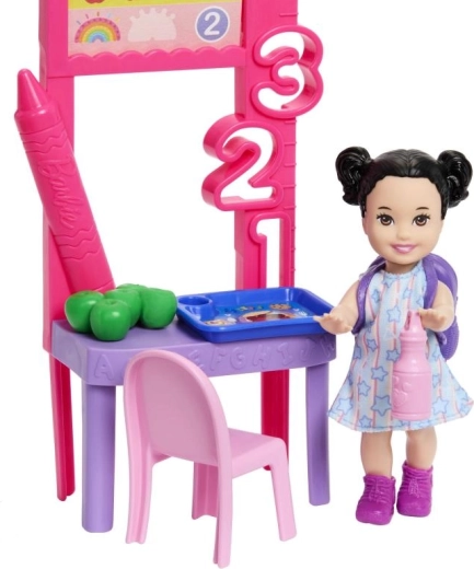 A szett része egy bájos ruhás Barbie baba, egy kis diákbaba, szék, hátizsák, tálca, ragasztó, könyv, plüssmackó és további iskolai kellékek. A könnyen megfogható kiegészítőknek és a levehető elemeknek köszönhetően a játék könnyű és szórakoztató már 3 éves kortól.