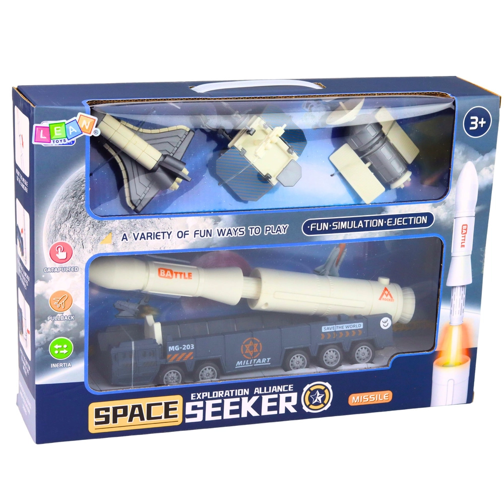 Ez a részletgazdag kozmikus készlet lehetővé teszi, hogy a gyerekek saját jeleneteket alkossanak indításokról, orbitális küldetésekről és földi előkészületekről. A speciális, többtengelyes alvázra szerelt rakéta, az űrrepülőgép és a műhold kombinációjával a kis felfedezők a teljes űrexpedíció menetét szimulálhatják – a rámpára szállítástól egészen a műhold pályára állításáig.