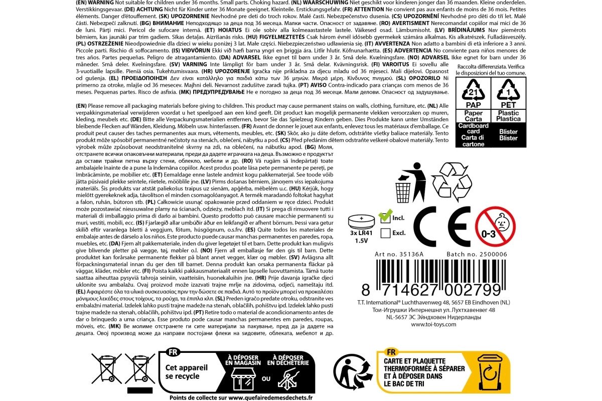 Az egész készlet tartós műanyagból készült, és azonnal használatra kész – 3× AG13 elem a csomagban. Remek ajándék kis kémeknek, amely fejleszti a kreativitást, a fantáziát és a finommotorikát.