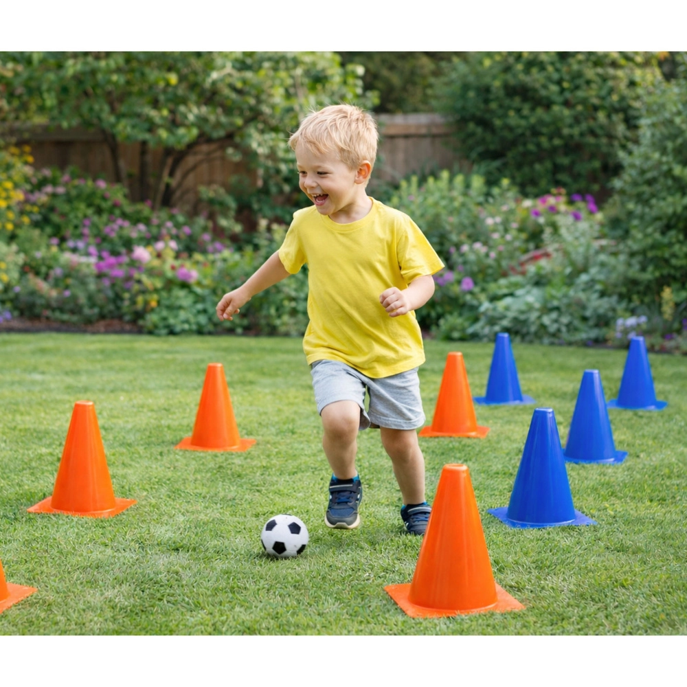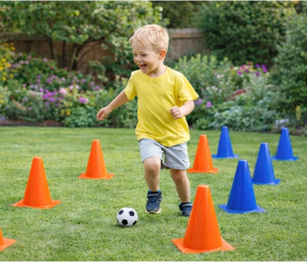 A telt narancssárga és kék színű kúpok segítik a gyerekeket a pálya követésében, és növelik az edzés biztonságát a pályán és a kertben is.
