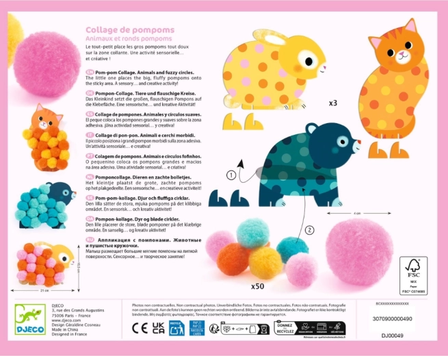 Fedezze fel az első alkotást a totyogóknak: a Djeco Pomponos kollázsok készlet lehetővé teszi a 18 hónapos kortól kezdve, hogy a gyerekek puha állatkákat bolyhos pomponokkal készítsenek. A masszív kartonalapnak és a nagy, puha pomponoknak köszönhetően a tevékenység egyszerű, biztonságos, és fejleszti a finommotorikát, az érzékelést és a kreativitást.