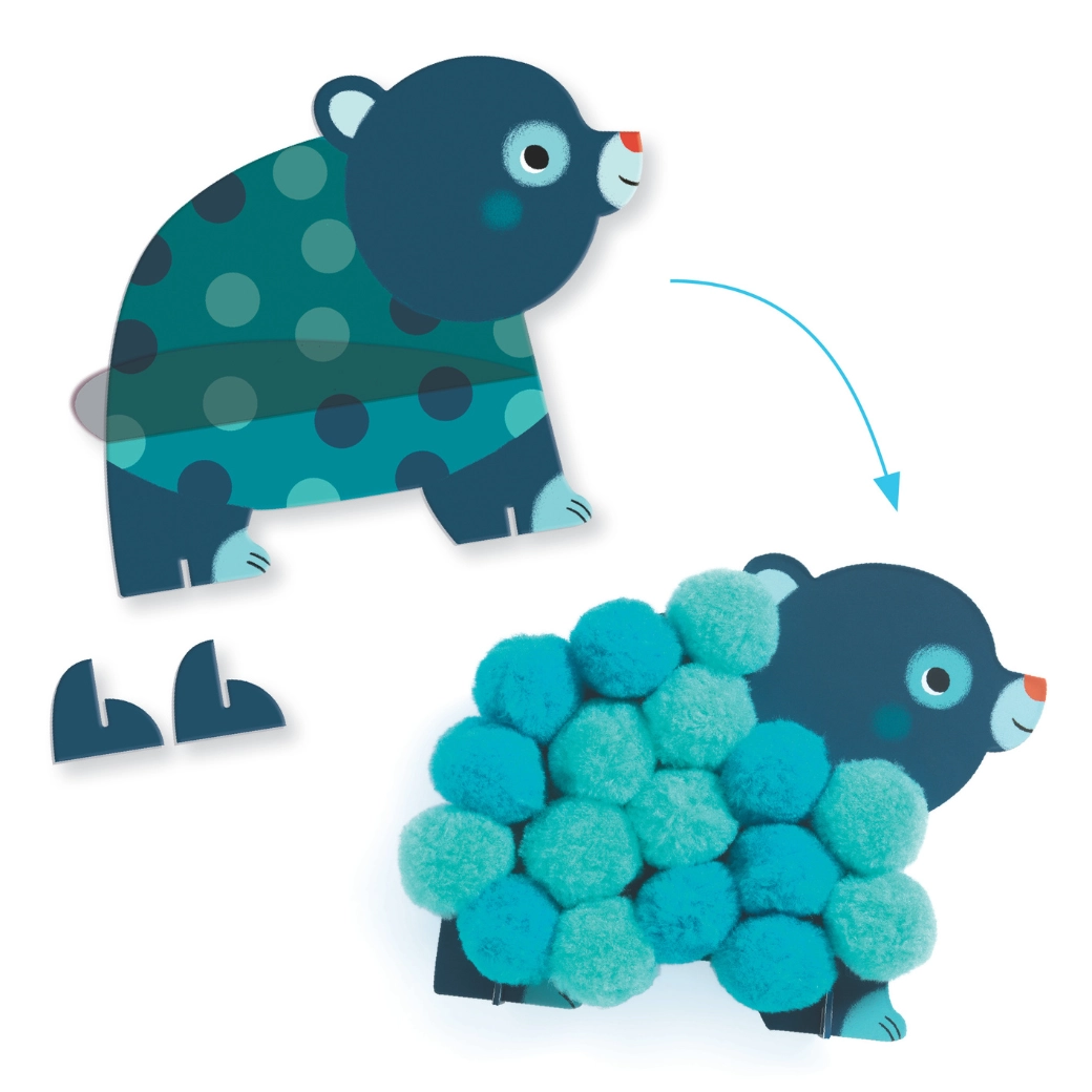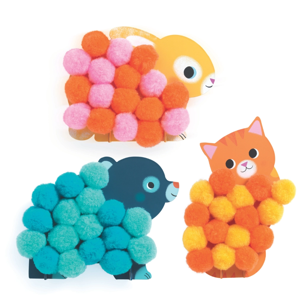 Ez a bájos kreatív készlet a Djeco márkától meghozza a gyerekek első alkotásának örömét. A színes, illusztrált állatka-alapokra a gyerekek puha pomponokat helyeznek, így kellemesen texturált bundát készítenek a nyuszinak, medvének vagy cicának. Az elemek nagyok és könnyen megfoghatók, ezért ideálisak a kis kezeknek.