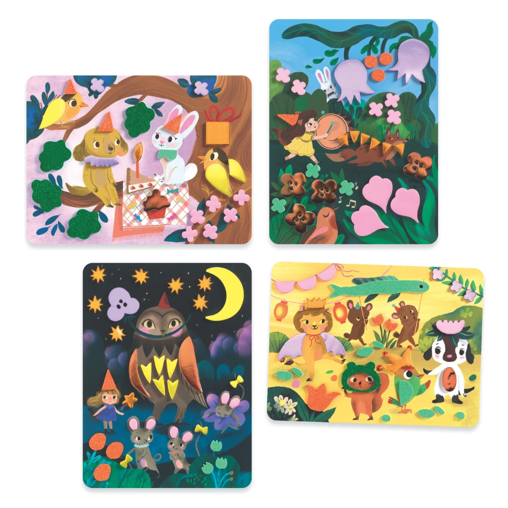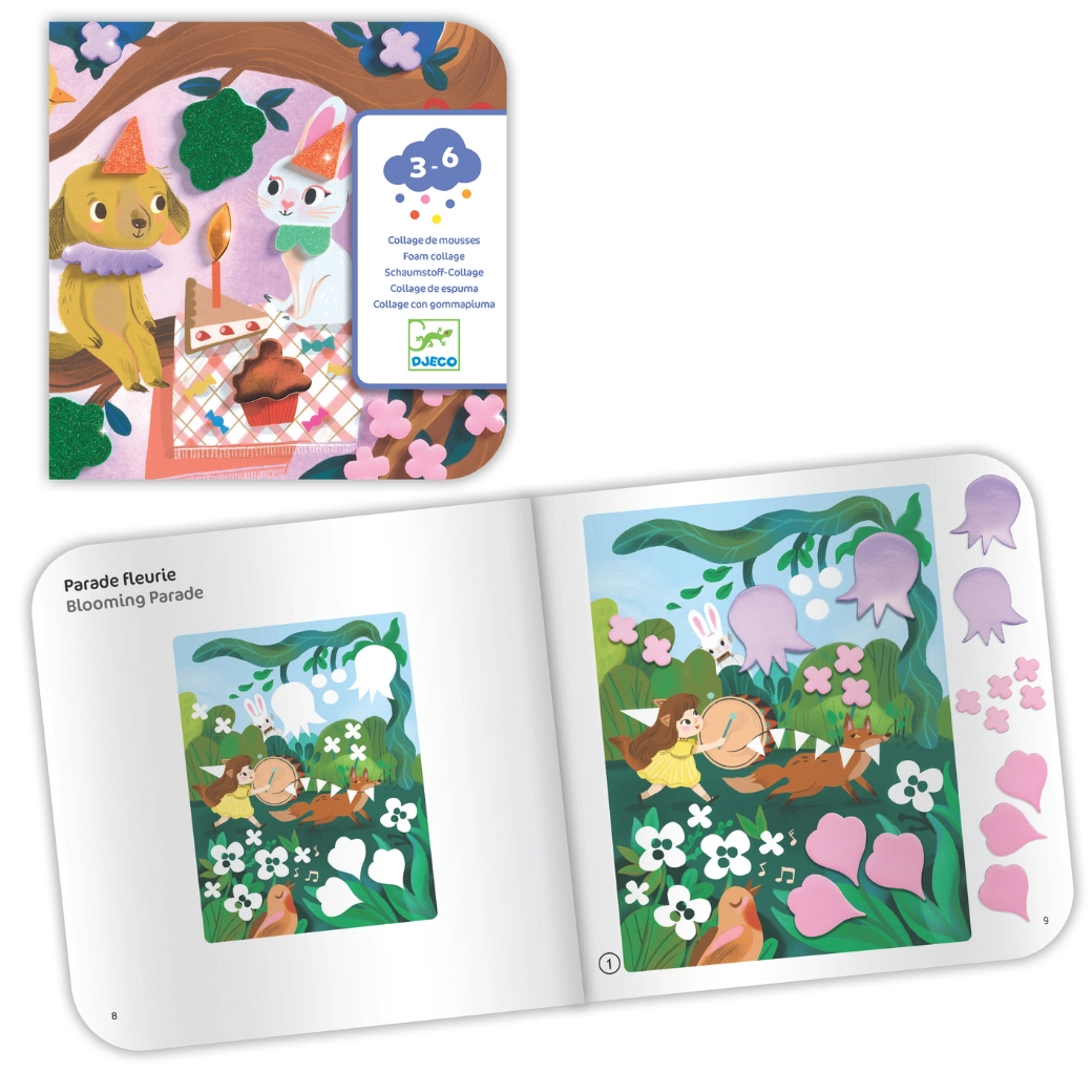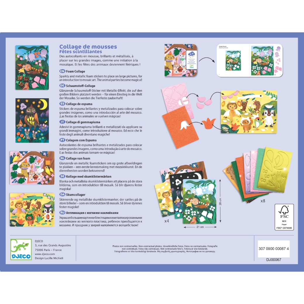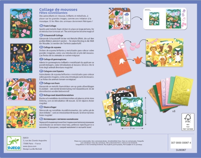 Ez az egyedi „Csillogó ünnepségek” habkollázs rendetlenség nélküli alkotás örömét nyújtja a gyerekeknek. Az előnyomott kartonalapok kedves állatfigurái színes, gyakran csillámos habformákkal egészülnek ki. A gyerekek egyszerűen lehúzzák az előre kivágott darabokat, és az útmutató vagy a saját fantáziájuk szerint felragasztják őket.