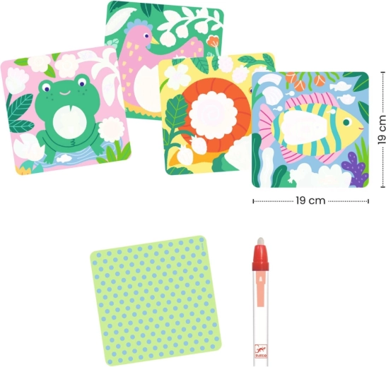 A Djeco vizes kifestői varázslatos élményt nyújtanak: a kezdetben visszafogott képek vízzel érintkezve színes jelenetté változnak, tele állatbarátokkal. Amint a kártyák megszáradnak, a színek eltűnnek, és a szórakozás elölről kezdődhet.