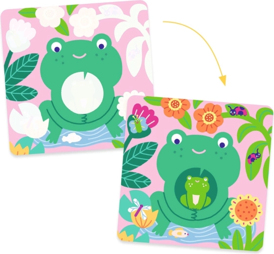 Erős, négyzet alakú kártyák bájos motívumokkal – béka, halacska, csiga és madárka – bírják a többszöri festést és könnyen tisztán tarthatók.
