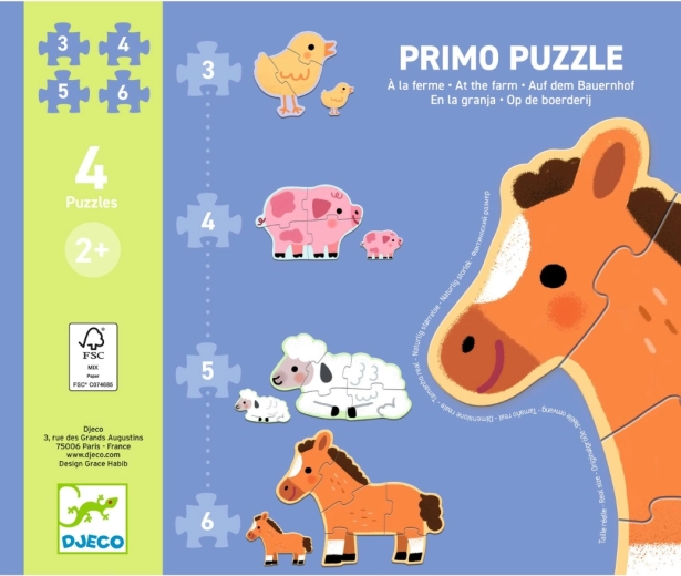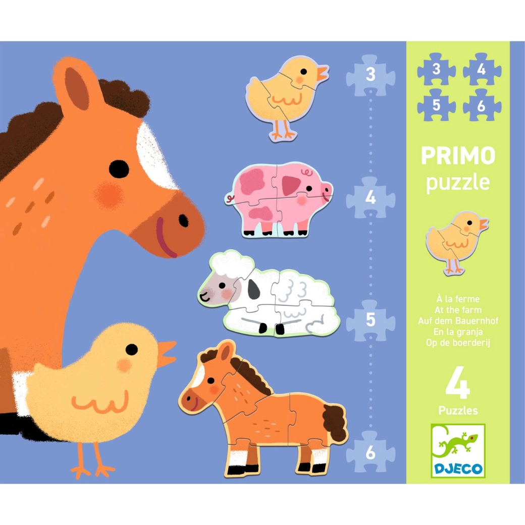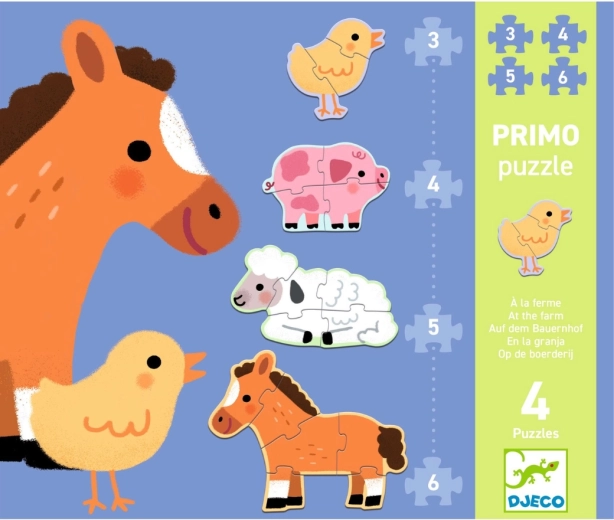 Első kirakó a legkisebbeknek vidéki témával: a Djeco Puzzle Primo A farmon aranyos farmállatok segítségével fejleszti a finommotorikát, a logikus gondolkodást és a vizuális észlelést.