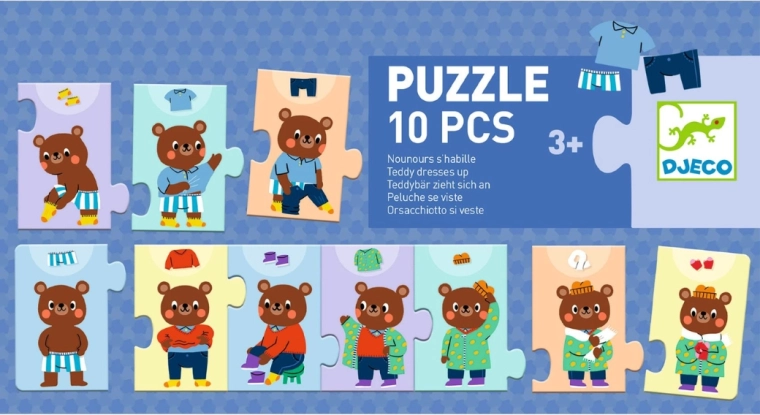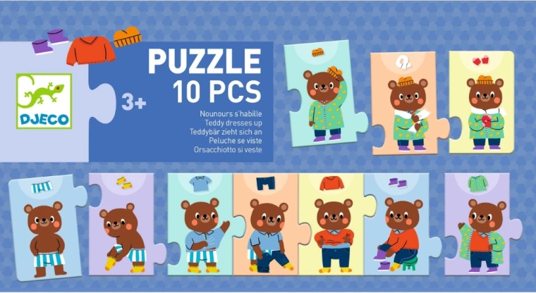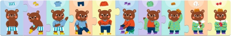 Szórakoztató gyerek puzzle, amelyben a gyerekek összeállítják, hogyan öltözik fel a mackó lépésről lépésre. Ideális a finommotorika, a logika és a lépések sorrendjének fejlesztésére. Tartalmaz 10 masszív darabot, minőségi kartont és gyerekeket lenyűgöző illusztrációkat.