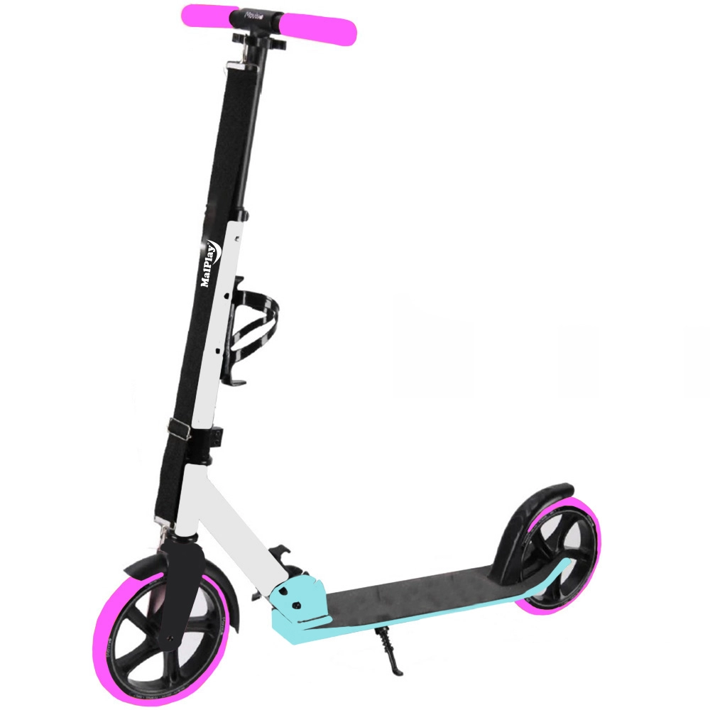 Stílusos városi roller fehér‑rózsaszín‑kék színben kényelmes ingázáshoz és szabadidőhöz. Kínál összecsukható vázat, nagy, puha 200 mm‑es PU kerekeket a sima haladáshoz, állítható kormánymagasságot és csúszásgátló fellépőt. A hátsó lábféknek és a hordozópántnak köszönhetően ideális városi utakhoz.