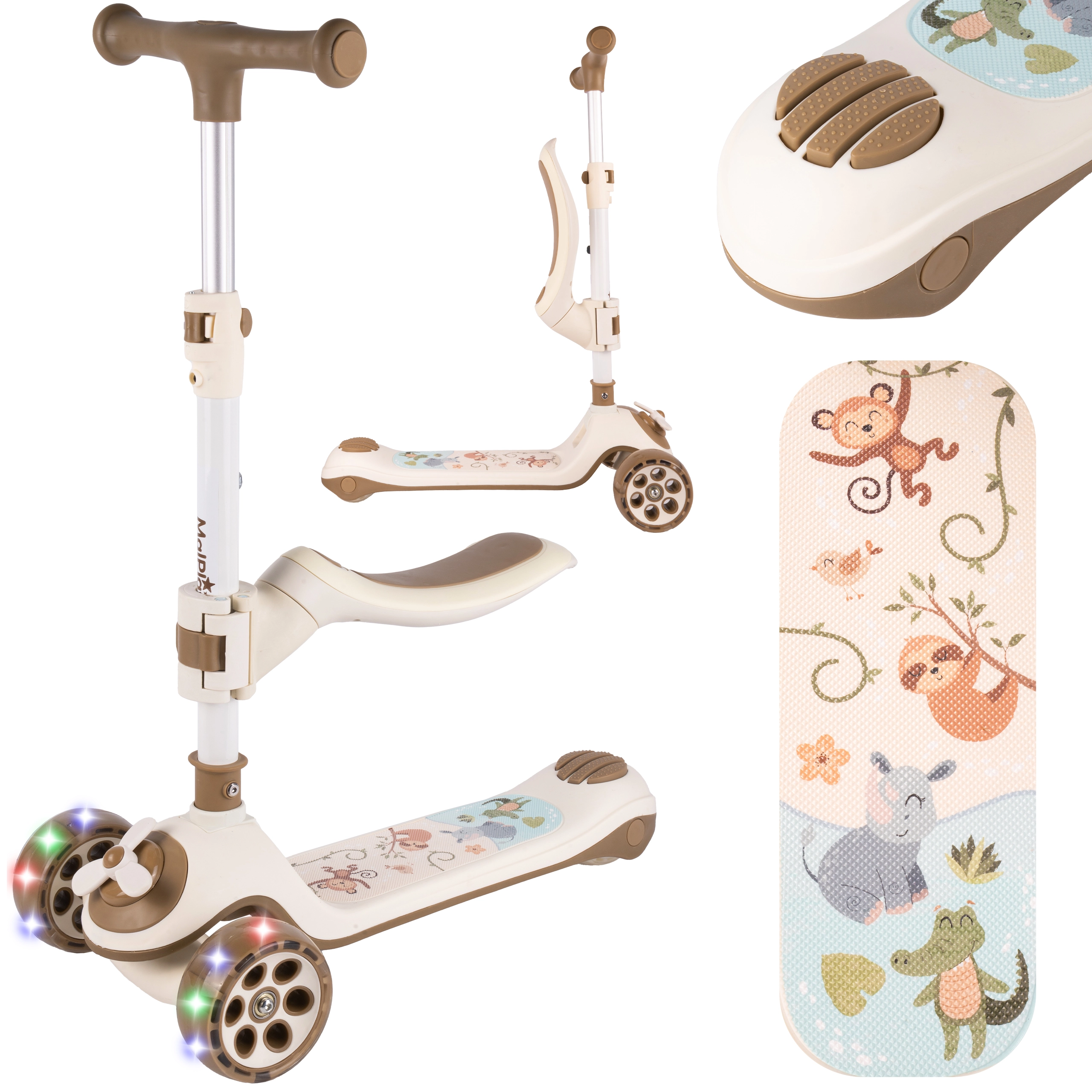 Könnyű gyerek roller üléssel, elegáns bézs színben, kényelmes haladással és kiváló stabilitással. Az első és hátsó kerekek LED világítással rendelkeznek, ami lenyűgözi a gyerekeket és növeli a láthatóságot. A alumíniumból és acélból készült konstrukció tartós, a TPR markolatok kényelmes fogást adnak, a csendes PU kerekek pedig sima gördülést biztosítanak különböző felületeken.