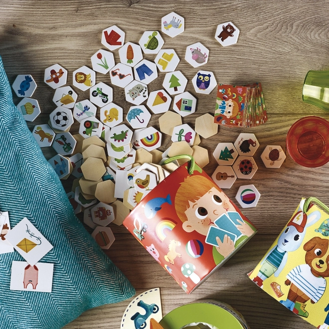 Tesztelje gyermeke figyelmét ezzel a szórakoztató memóriajátékkal. Keresse meg a képet, amely ugyanolyan, mint a kártyán. Erős fa darabok biztosítják a játék tartósságát.