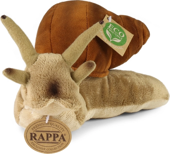 Aranyos, 24 cm hosszú plüss csiga a RAPPA exkluzív kollekciójából, puha anyagból készítve és újrahasznosított szálakkal töltve PET palackokból. A kézi kidolgozásnak köszönhetően élethű hatású, újszülöttkortól biztonságos és kíméletes a környezethez.