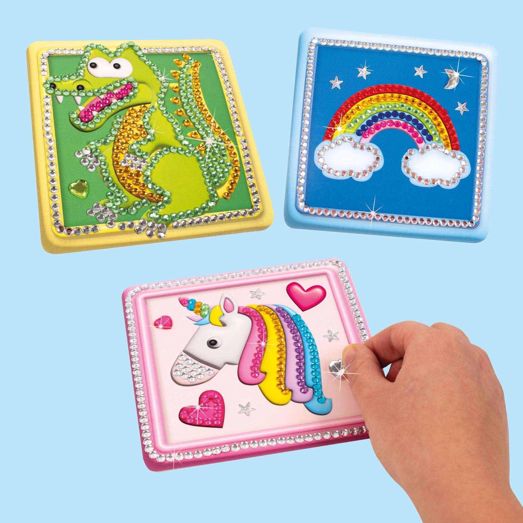 Fedezze fel a diamond painting varázsát, és tegye a szabad perceket kreatív élménnyé. A készlet három motívumot tartalmaz erős sablonokon 18 × 21 cm méretben, valamint minden kiegészítőt, amelyre a kövecskék kényelmes felhelyezéséhez szüksége lehet. Egyszerű folyamata miatt kezdőknek és felnőtt felügyelete mellett gyerekeknek is alkalmas.