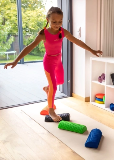 A tüskékkel ellátott texturált felület szenzoros visszajelzést ad egyensúlygyakorlatok közben, otthoni edzéshez gyermekeknek és felnőtteknek egyaránt alkalmas.