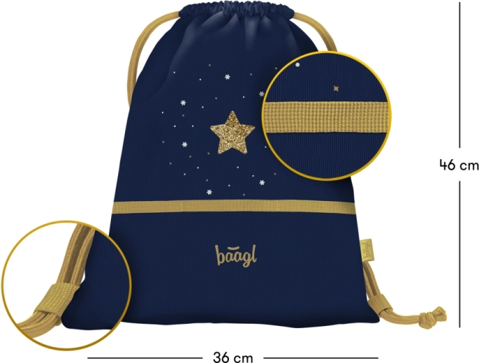Stílusos BAAGL tornazsák Unicorn Gold dizájnnal, ideális cipőnek és apróságoknak szabadidős használatra. Erős, mosható anyagot, zsinóros összehúzást a háton való hordáshoz és praktikus karabinert a táskához való rögzítéshez kínál.