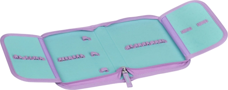 Teljes kihajtás után tökéletes rálátást kap a tartalomra, így még az órák alatt is gyorsan megtalál mindent. Az erős gumipántok biztonságosan tartják a klasszikus és a háromszögletű írószereket, a kis zseb és az órarend-ablak sem hiányzik. A fenntartható szemléletet az újrahasznosított szálakból készült anyag hangsúlyozza.