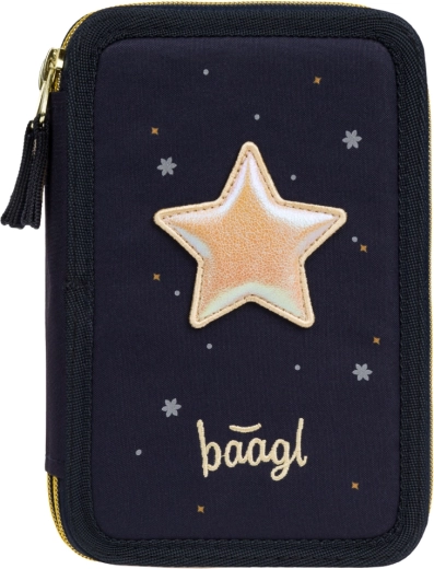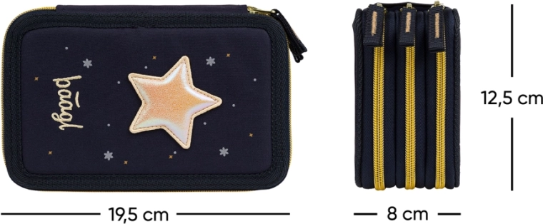 A praktikus, háromszintes BAAGL Unicorn Gold tolltartó sötétkék kivitelben, látványos részletekkel, átgondolt rendszerezést kínál az iskolai felszerelésekhez. Három külön cipzáras rekesz biztosítja a gyors hozzáférést és a rendet, míg a megerősített gerinc a teljes megtöltés mellett is megkönnyíti a zárást.