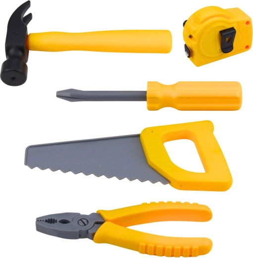 Kalapács, fűrész, csavarhúzó, fogó, mérőszalag, csavarok és lapocskák – minden a biztonságos és kreatív építéshez és szétszereléshez.