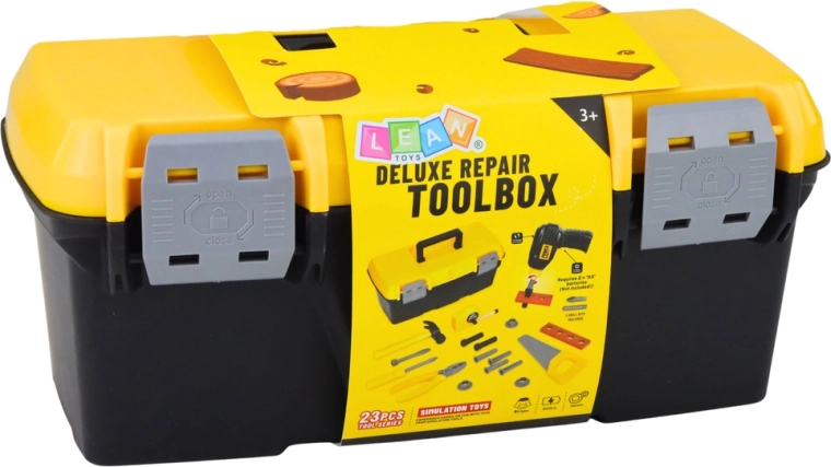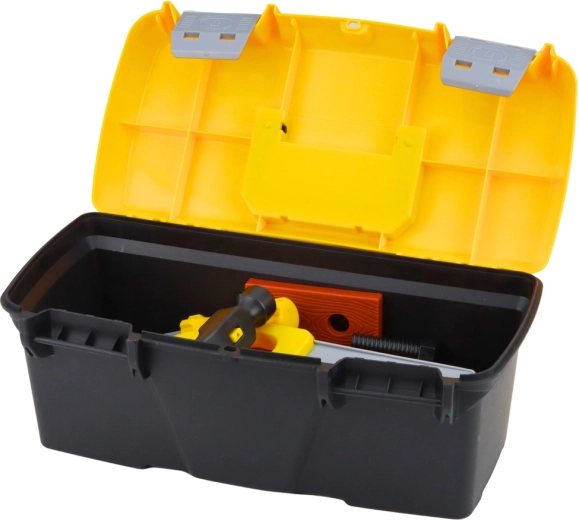 A masszív doboz fedéllel és reteszekkel rendezetten tartja az eszközöket, rendre szoktatja a gyerekeket és megkönnyíti a hordozást.