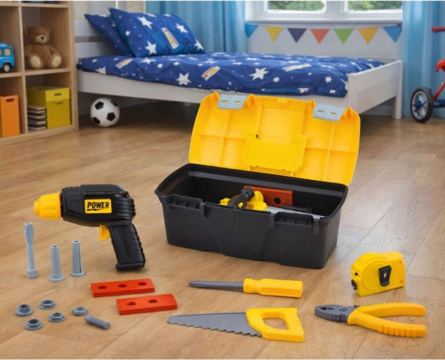 A 2× AA elemmel működő (nem tartozék) gyerekfúró utánozza a csavarozást, és ösztönzi a gyerekeket a kreatív játékra és a finommotorika fejlesztésére.