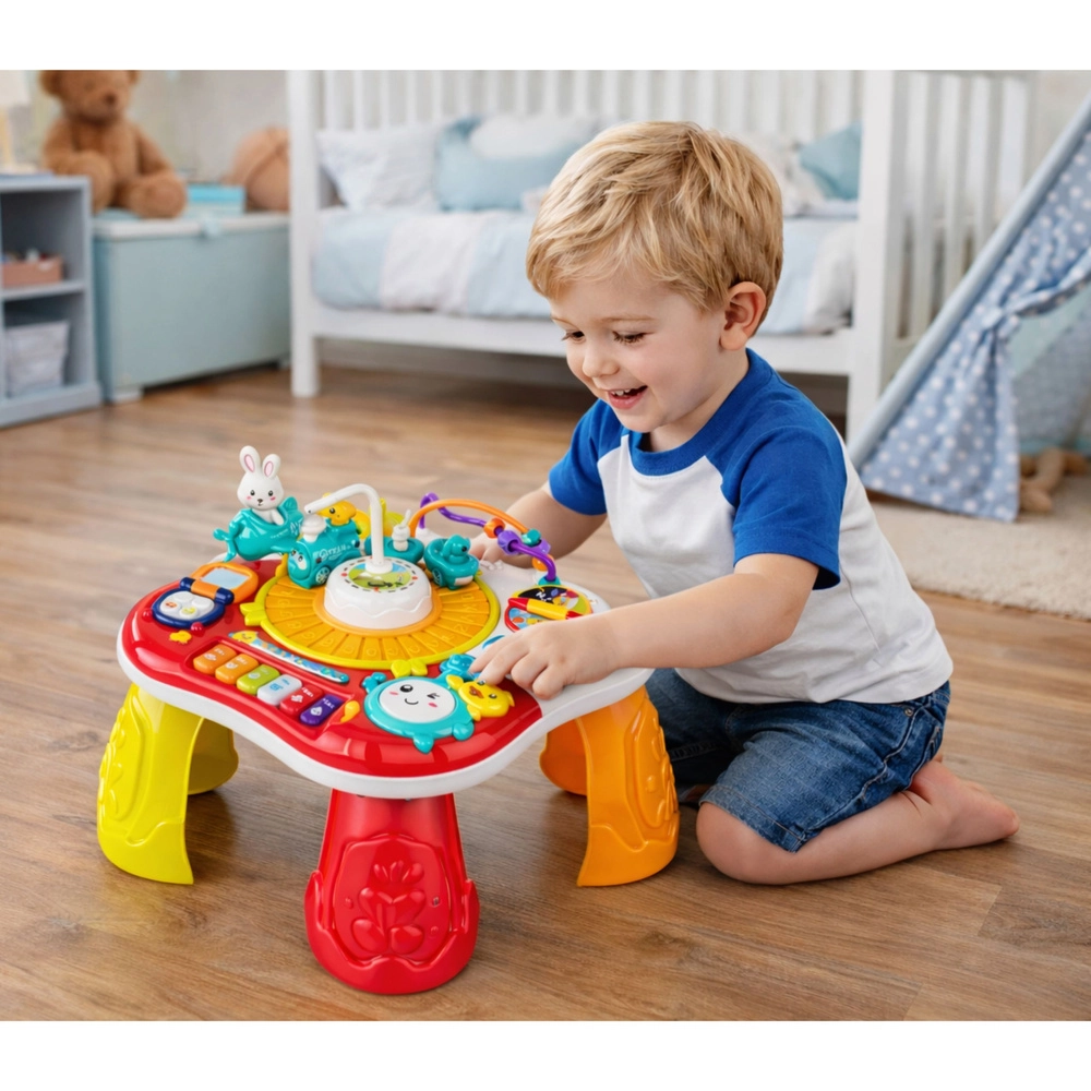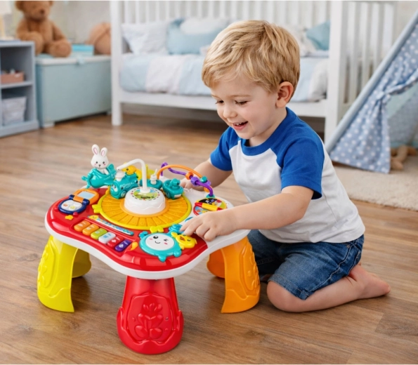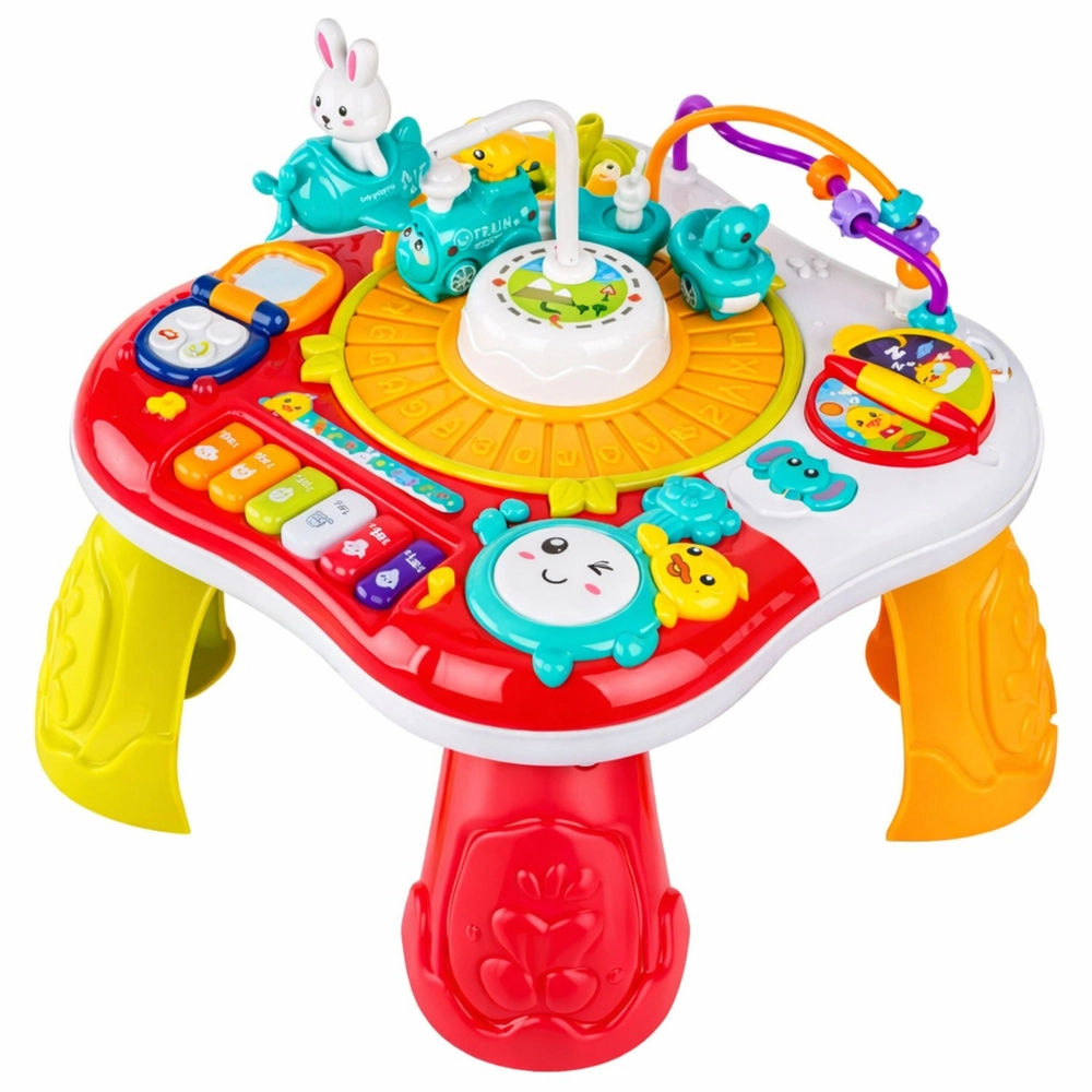 Az interaktív 2 az 1-ben oktatóasztal remek választás a gyermekek érzékeinek és készségeinek fejlesztéséhez. Kínál zongorát dallamokkal, fény- és hangeffekteket, telefonimitációt, forgó kerekeket és fogaskerekeket, valamint egy mozgó nyuszit, amely felkelti a figyelmet. A levehető lábaknak köszönhetően könnyedén átalakítható lapos oktatási panelré – ideális különböző életkori szakaszokhoz.