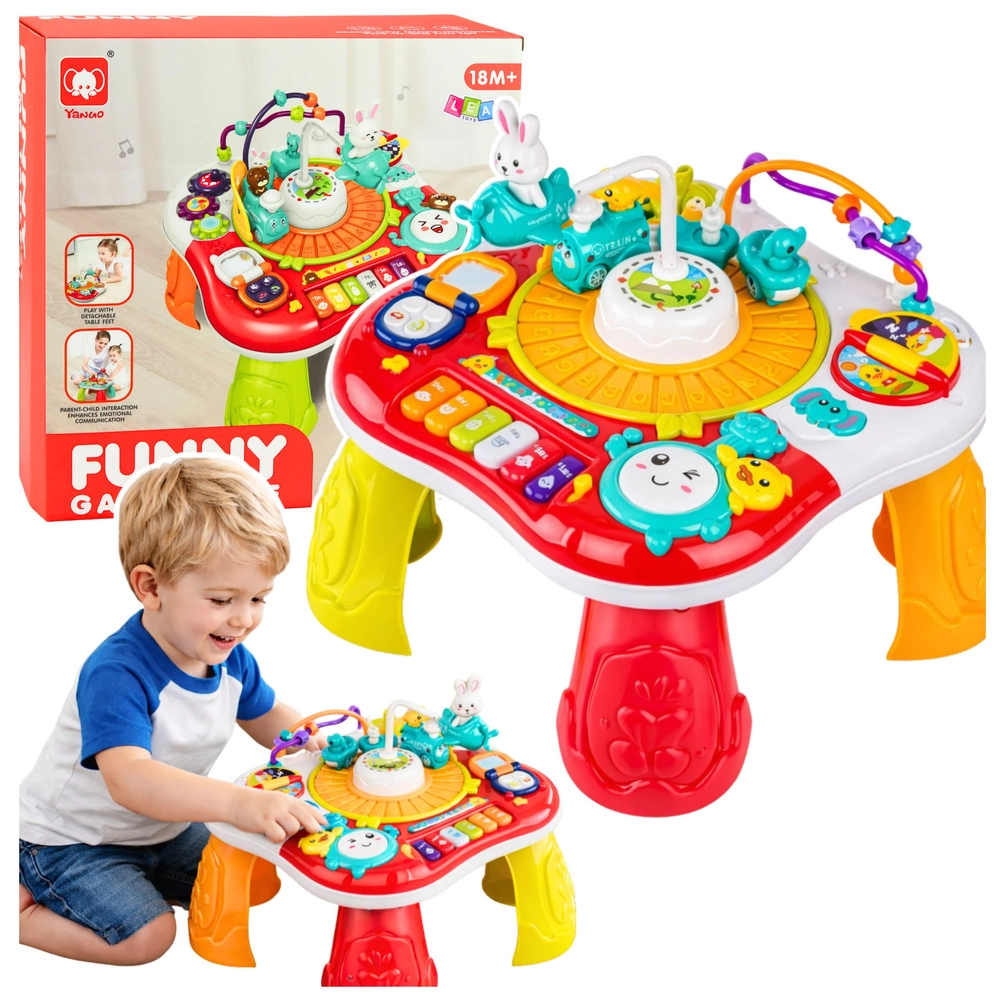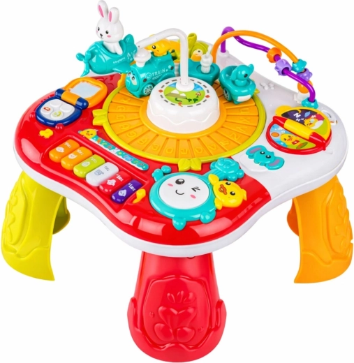 A 2 az 1-ben oktatóasztal a játékos tanulást támogatja: a gyerekek felfedezik a színeket, formákat és hangokat, fejlesztik a finommotorikát és a szem–kéz koordinációt. A szórakozás középpontjában a mozgó nyuszi áll, amely fel-le mozog, miközben a zongora vidám dallamokat játszik, a dob pedig mókás hangokat ad ki. A telefon és a gombok élethű funkciói ösztönzik a képzelőerőt és az önálló felfedezést.