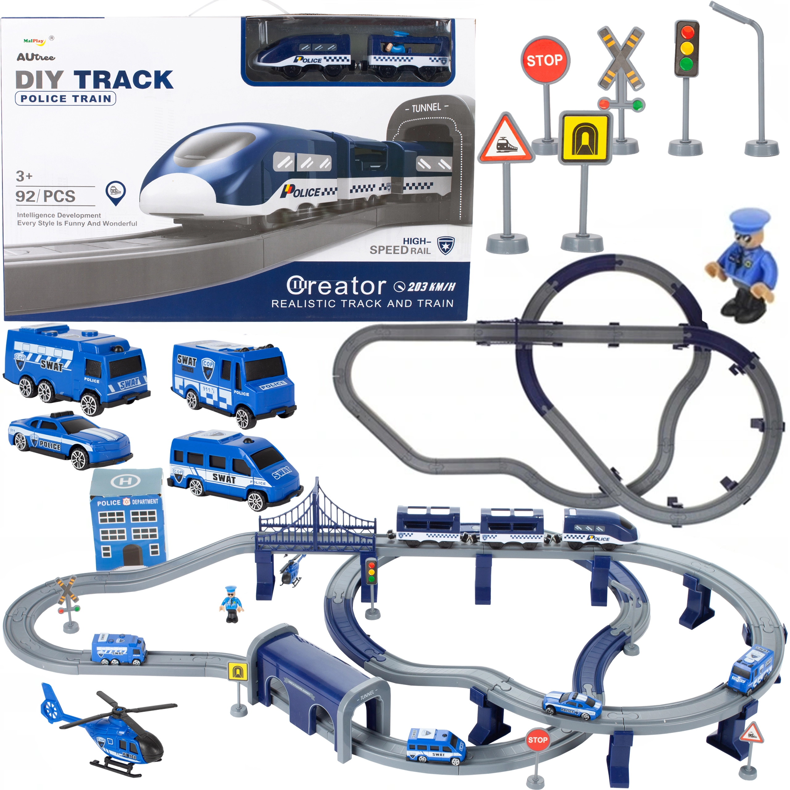 Ez a rendőrségi vonatpálya órákon át tartó szórakozást nyújt, körülbelül 103 × 61 × 15 cm-es méretben. A gyerekek saját városi jeleneteket alkothatnak – a vonat indulásától a vasúti átjárókon át egészen a helikopter bevetéséig. A mozdony elemmel működik, és hangokkal egészül ki, amelyek valósághű hangulatot adnak a játéknak.