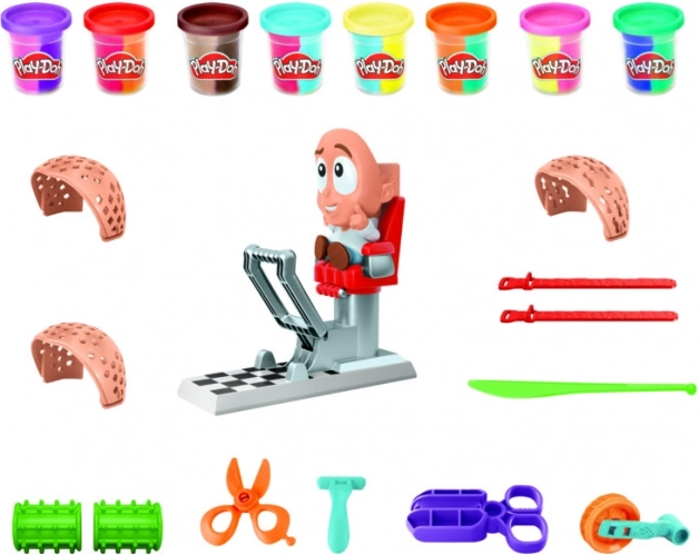 - Figura székkel, préselő alap, olló, fésű, formák, Play-Doh modellező gyurma tégelyek (több színben)