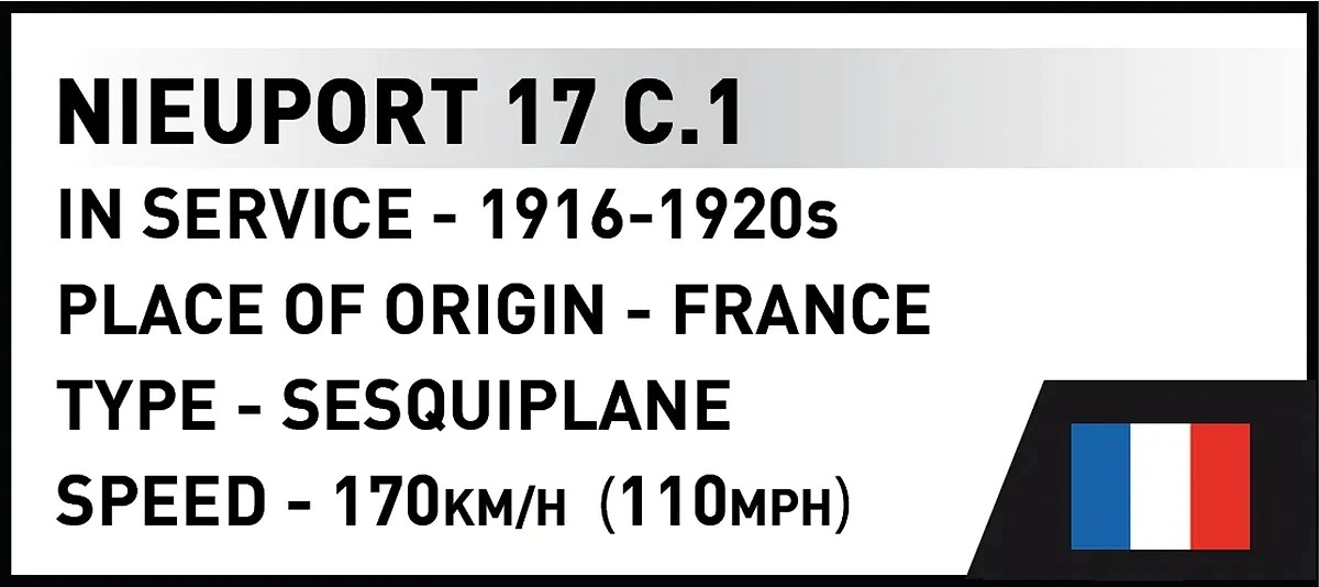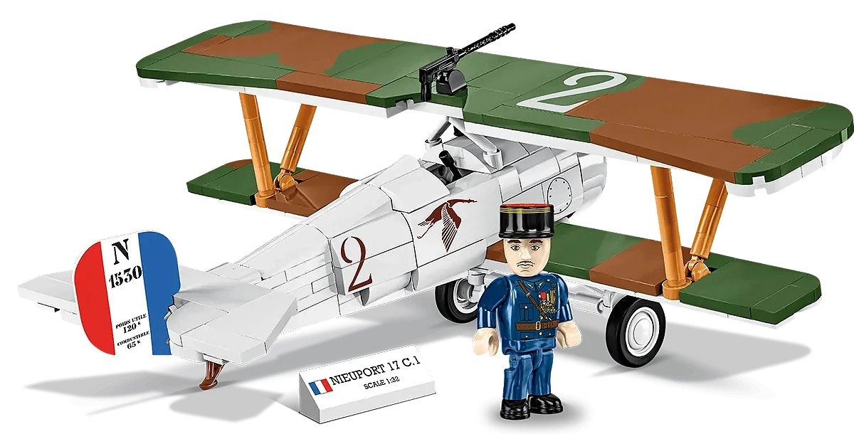 Fedezze fel az ikonikus Nieuport 17 C.1-et – könnyű, gyors és rendkívül fordulékony vadászgép, amely a Nagy Háború idején a szövetséges légierő szimbólumává vált. A modell hűen adja vissza a jellegzetes sesquiplane elrendezést (kisebb alsó szárny), a részletes, merevített szárnyakat, a géppuskát és a karakteres jelöléseket. A csomag része a névtáblás állvány a látványos kiállításhoz.
