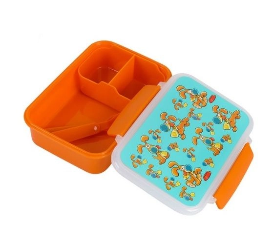 A stílusos, kutyás mintájú uzsonnás doboz elegendő helyet kínál szendvicseknek, gyümölcsnek és apró nassoknak. A kompakt méreteknek köszönhetően könnyen elfér iskolatáskában vagy kézitáskában, az integrált evőeszközök pedig kényelmes étkezést biztosítanak bárhol.