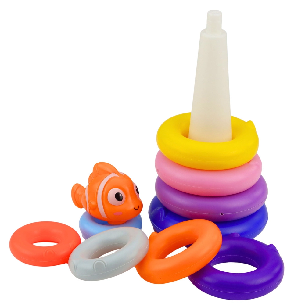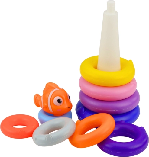 Ez a klasszikus karikapiramis 10 különböző méretű és élénk színű elemből áll. A gyerekek a karikákat a kúpos rúdra helyezik a legnagyobbtól a legkisebbig, a tetejére pedig a halacska figurát teszik. A játék természetes módon fejleszti a türelmet, a koncentrációt, valamint a rendezés és összehasonlítás képességét.