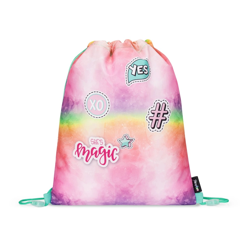 Az OXY GO Magic iskolai szett az attraktív, szivárványos dizájnt magas fokú praktikummal ötvözi minden iskolai napra. Fő eleme a könnyű hátizsák ergonomikusan formázott és légáteresztő háttal, állítható vállpántokkal és okos kampókkal a hosszabb pántok rögzítéséhez. A nagy főrekesz és a belső zsebek rendezetten tartják a tankönyveket, füzeteket és az uzsonnát, míg a masszív, vízálló alj megóvja a tartalmat a nedvességtől és a szennyeződéstől.