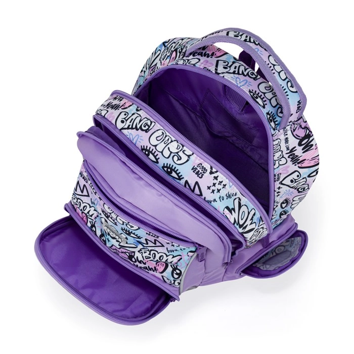 A belső elrendezést két tágas rekesz alkotja a tankönyveknek és füzeteknek, amelyeket praktikus kisebb zsebek egészítenek ki az apróságoknak. Az oldalakon két zseb található – egy nyitott a kulacsnak és egy cipzáras a biztonságos tároláshoz. Nem hiányoznak a fényvisszaverő elemek sem a jobb láthatóságért szürkületben, valamint a kampók a hosszú pántok rögzítéséhez a rendezett és biztonságos megjelenésért.