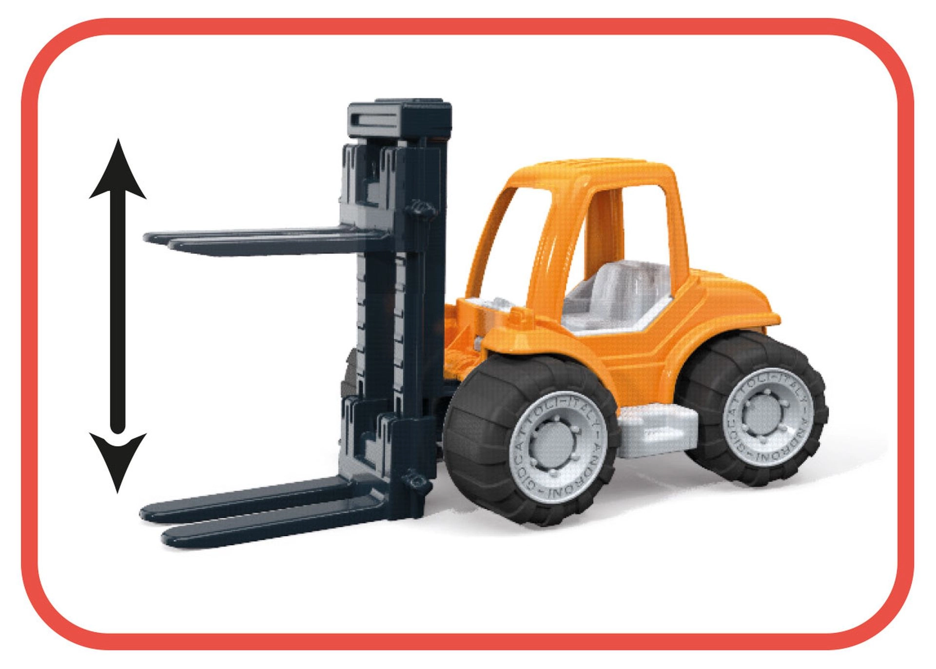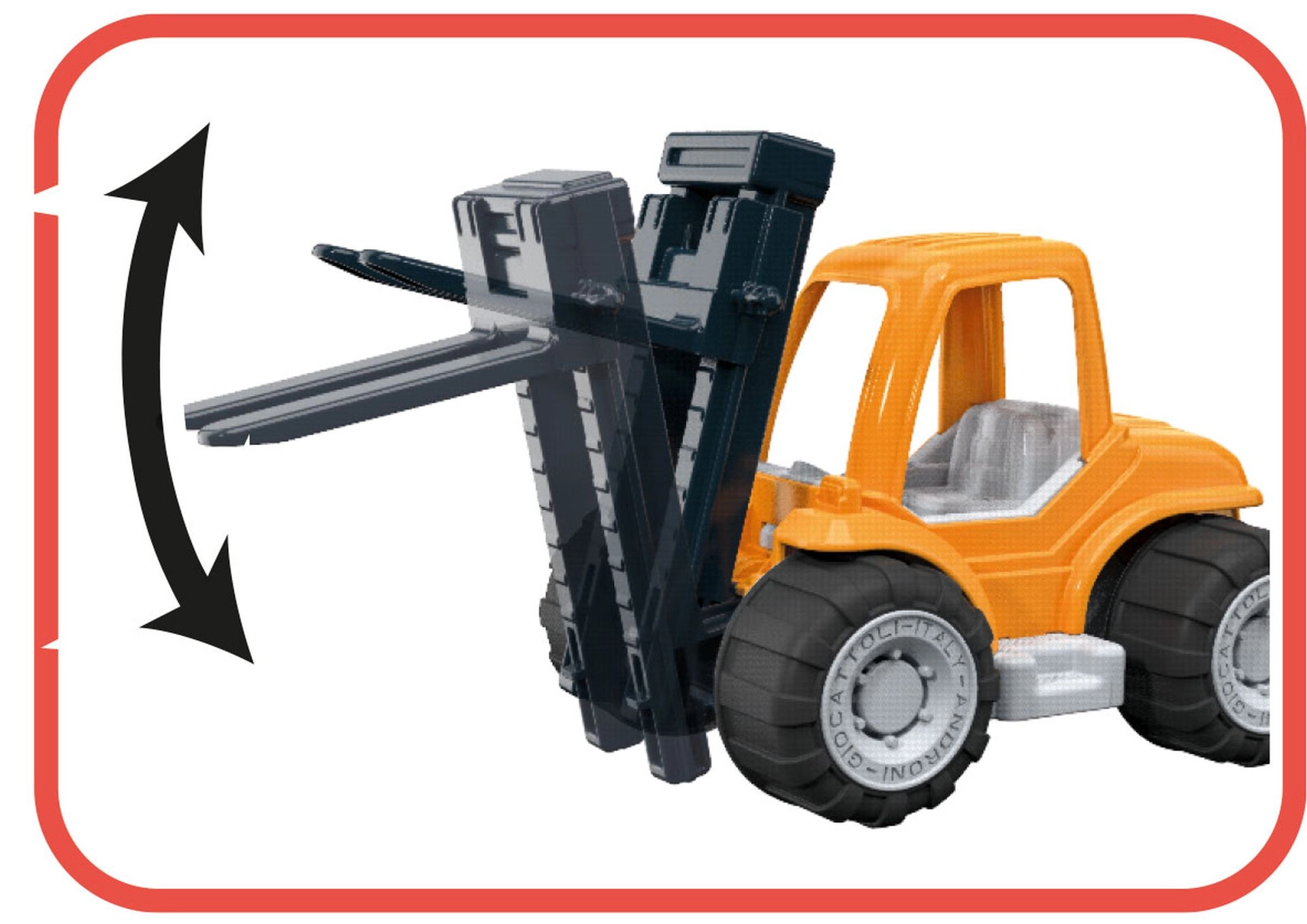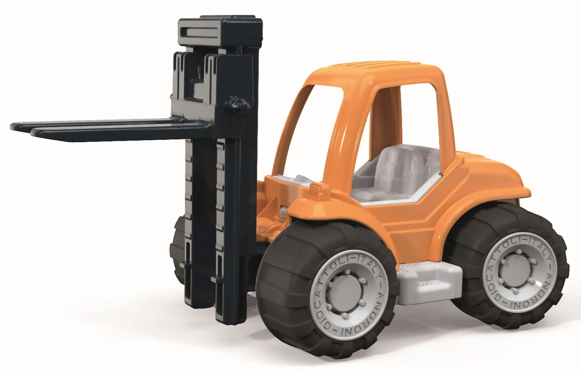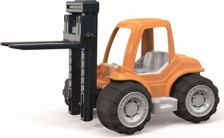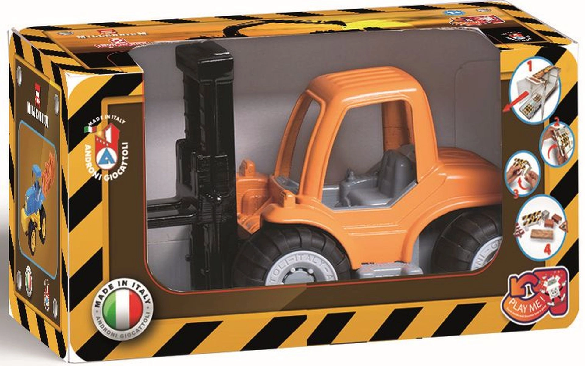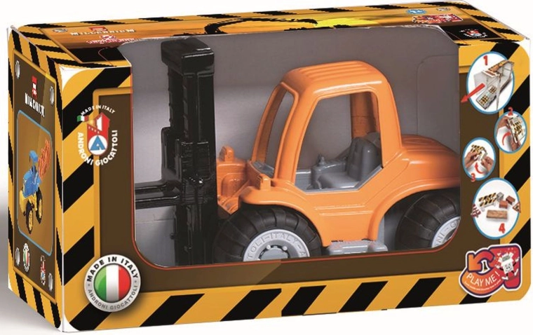 Masszív műanyag Millennium sorozatú Androni targonca, amely már 10 hónapos kortól örömet szerez a kis építőknek. Mozgatható emelővillával, gumírozott kerekekkel a stabilitásért, valamint karton építőkockákkal a játékforgatókönyvek megalkotásához. Olaszországban készült, minőségi műanyagokból.