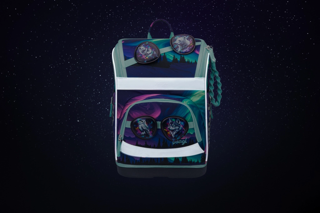 A szett része a tágas, egyszintes tolltartó lehajtható fülekkel, erős gumipántokkal és órarend-ablakkal, továbbá praktikus tornazsák cipzáras zsebbel váltócipőhöz vagy sporthoz, és egy nyakba akasztható pénztárca névcímkével és biztonsági kioldóval. Minden az Aurora, sarki fényt idéző, látványos dizájnban, fényvisszaverő elemekkel a jobb láthatóságért.