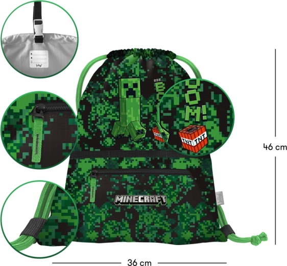 A praktikus iskolai tornazsák Minecraft Boom mintával ideális váltócipőhöz, tornacuccokhoz és szabadidős tevékenységekhez. Tágas cipzáras zsebet, erős húzózsinórokat a kényelmes viseléshez és tartós, lemosható anyagot kínál. A csattal ellátott akasztónak köszönhetően könnyedén a hátizsákhoz vagy az iskolatáskához rögzíthető.
