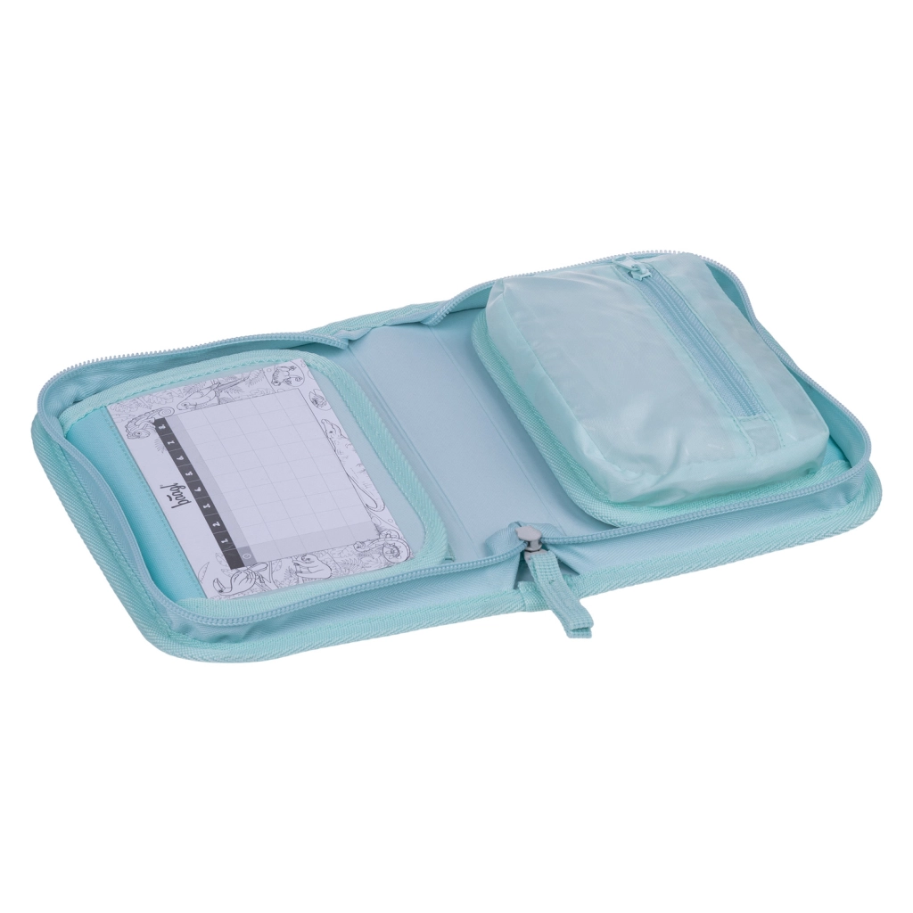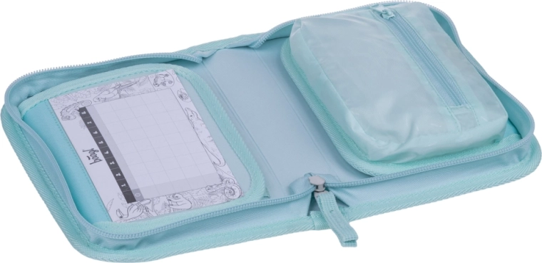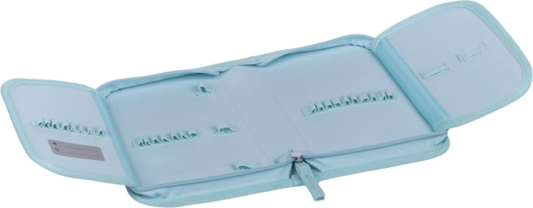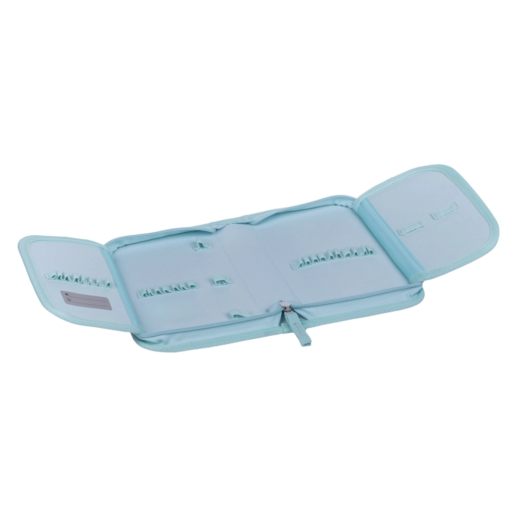 A belső tér úgy lett kialakítva, hogy elférjenek benne ceruzák, tollak és filcek, beleértve a háromszög alakúakat is. Belül kis zsebecske található apróságoknak és praktikus órarend-ablak. A tolltartó töltet nélkül kerül forgalomba, és újrahasznosított anyagból készül, támogatva a környezettudatos megközelítést.
