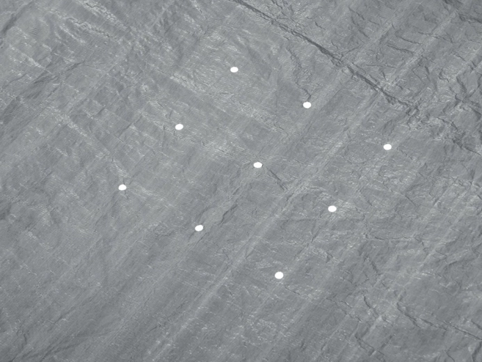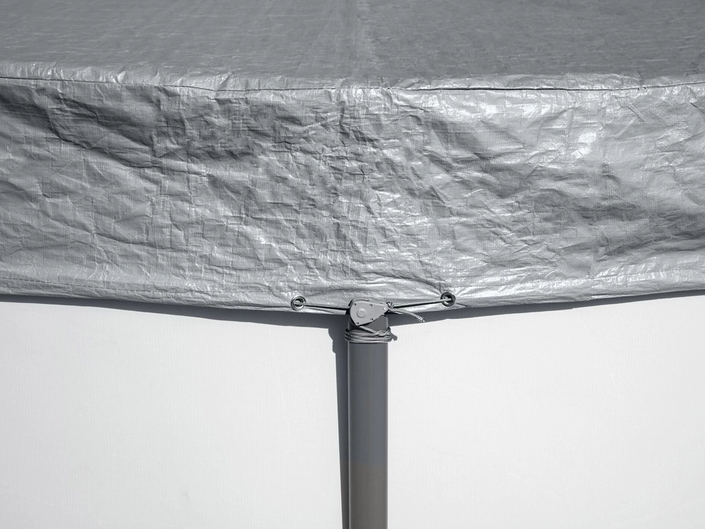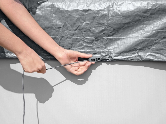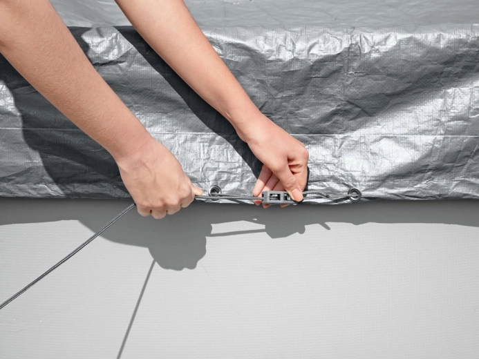 Az okos vízelvezető nyílások áteresztik az esővizet, így nem alakulnak ki tócsák a takarón. A szélálló szorítós mechanizmus és a húzózsinór biztosítja a szoros illeszkedést a perem mentén, hogy a takaró rosszabb időjárási körülmények között is a helyén maradjon.