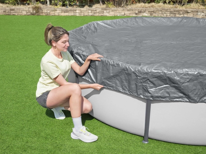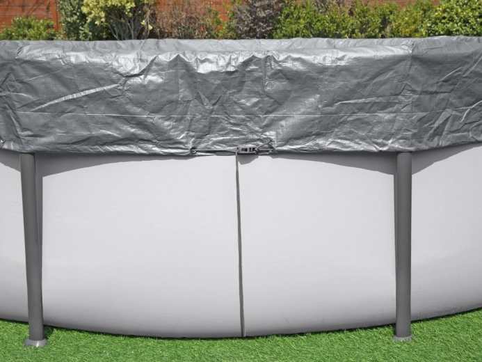 A szorítós mechanizmus és a húzózsinór stabilan a helyén tartja a takarót, és javítja a tapadást a medence teljes kerületén.