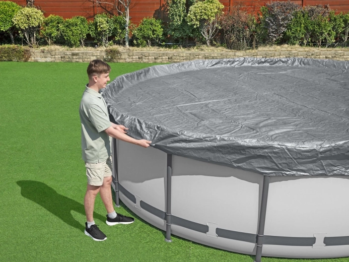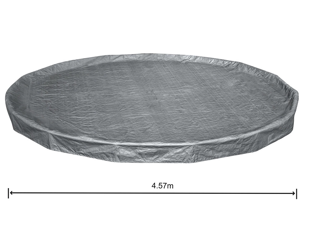 Tartós medencetakaró 4,57 m átmérővel, amely megóvja a vizet a levelektől, fűtől és szennyeződésektől. Megerősített anyagból készült, UV-védelemmel, szélálló húzózáras rögzítőrendszerrel a biztos illeszkedéshez és vízelvezető nyílásokkal az esővíz felgyülemlése ellen. A Polar‑Shield technológiának köszönhetően alacsony hőmérsékleten is helytáll egészen −25 °C-ig.