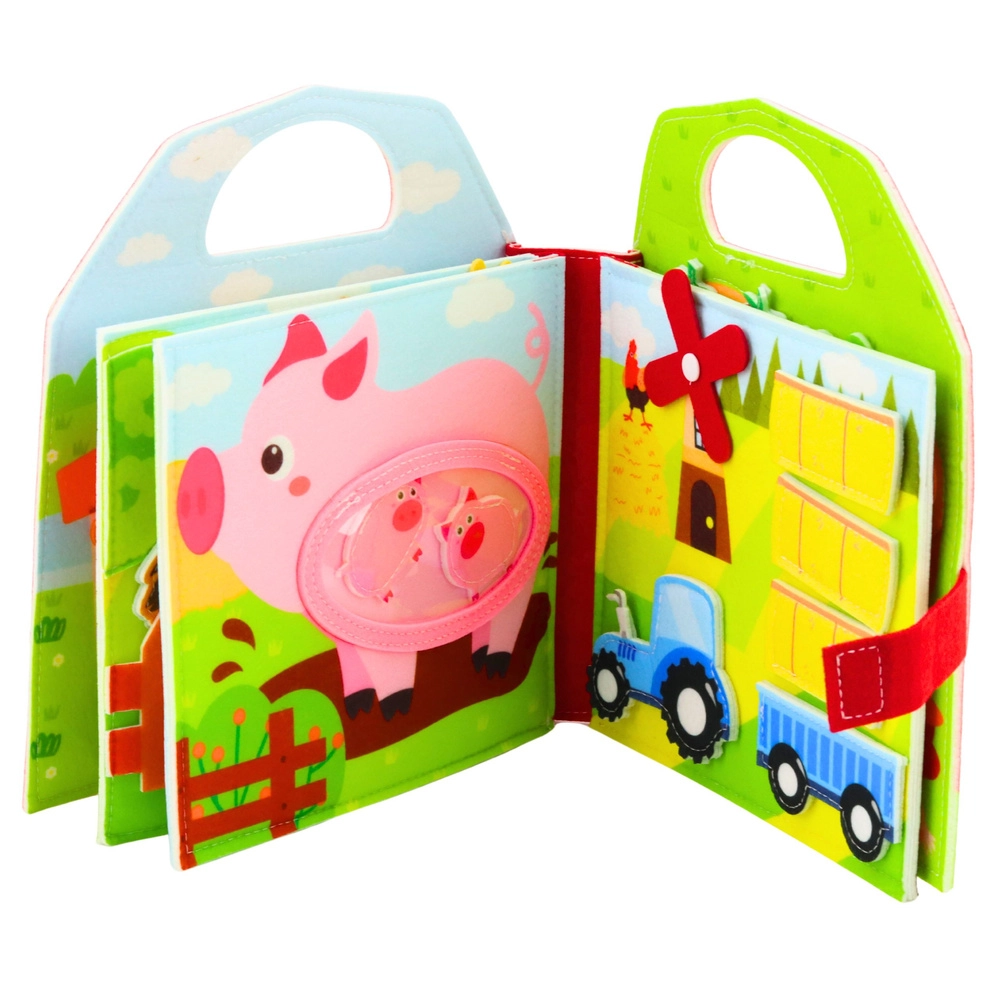 Ez a színes, tanyát formázó szenzoros könyv rengeteg tevékenységet kínál: nyitható ajtócskák, mozgatható és áthelyezhető filc darabok, valamint tapintásos elemek hívogatnak felfedezésre. A gyerekek játékos módon tanulják meg felismerni a tanyasi állatokat (tehén, ló, malac, kacsa stb.), a színeket és formákat, miközben fejlesztik érzékeiket.