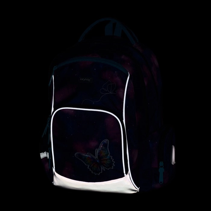 Stílusos iskolatáska az alsó tagozat számára pillangó- és galaxis-mintával, ergonomikus, légáteresztő hátkialakítással, állítható pántokkal kiegészítő fülekkel, könnyű szerkezettel és gazdag belső rendszerezéssel. A fényvisszaverő elemek növelik a biztonságot, a masszív, vízálló alj véd a nedvességtől és szennyeződéstől, a 22 l-es űrtartalom pedig elegendő helyet biztosít a tankönyveknek és a szabadidős holmiknak.