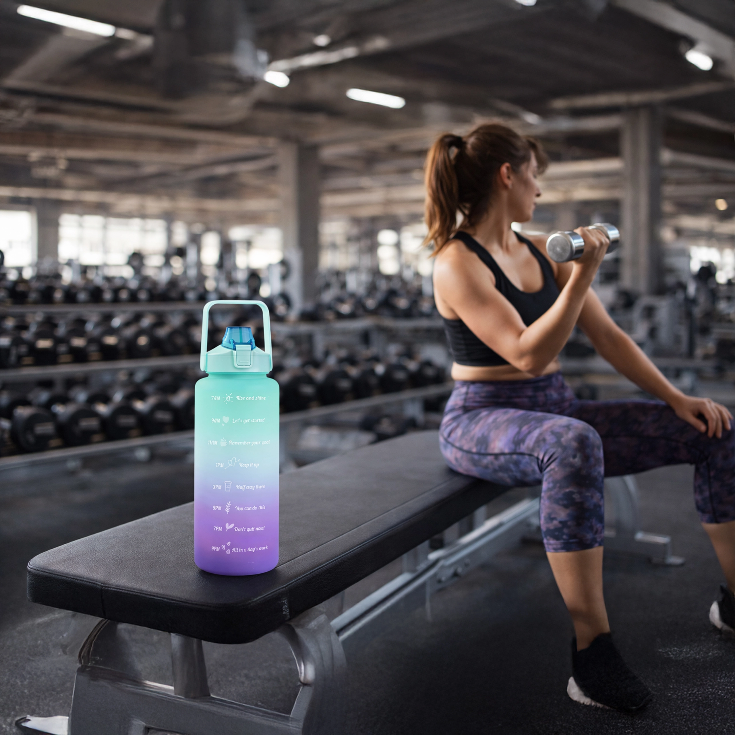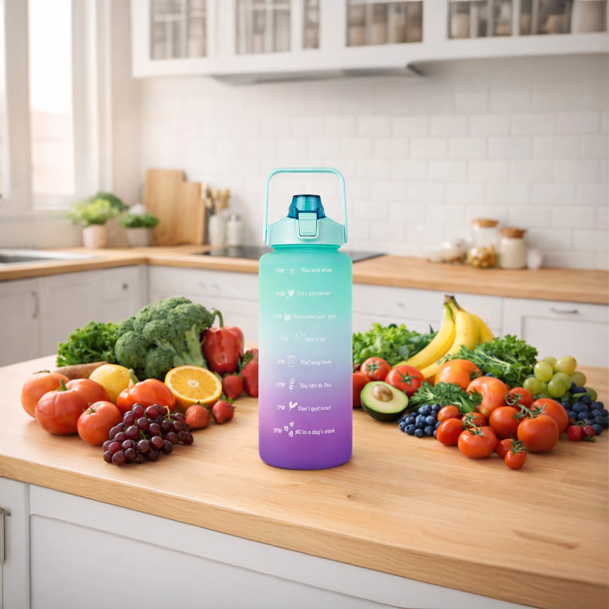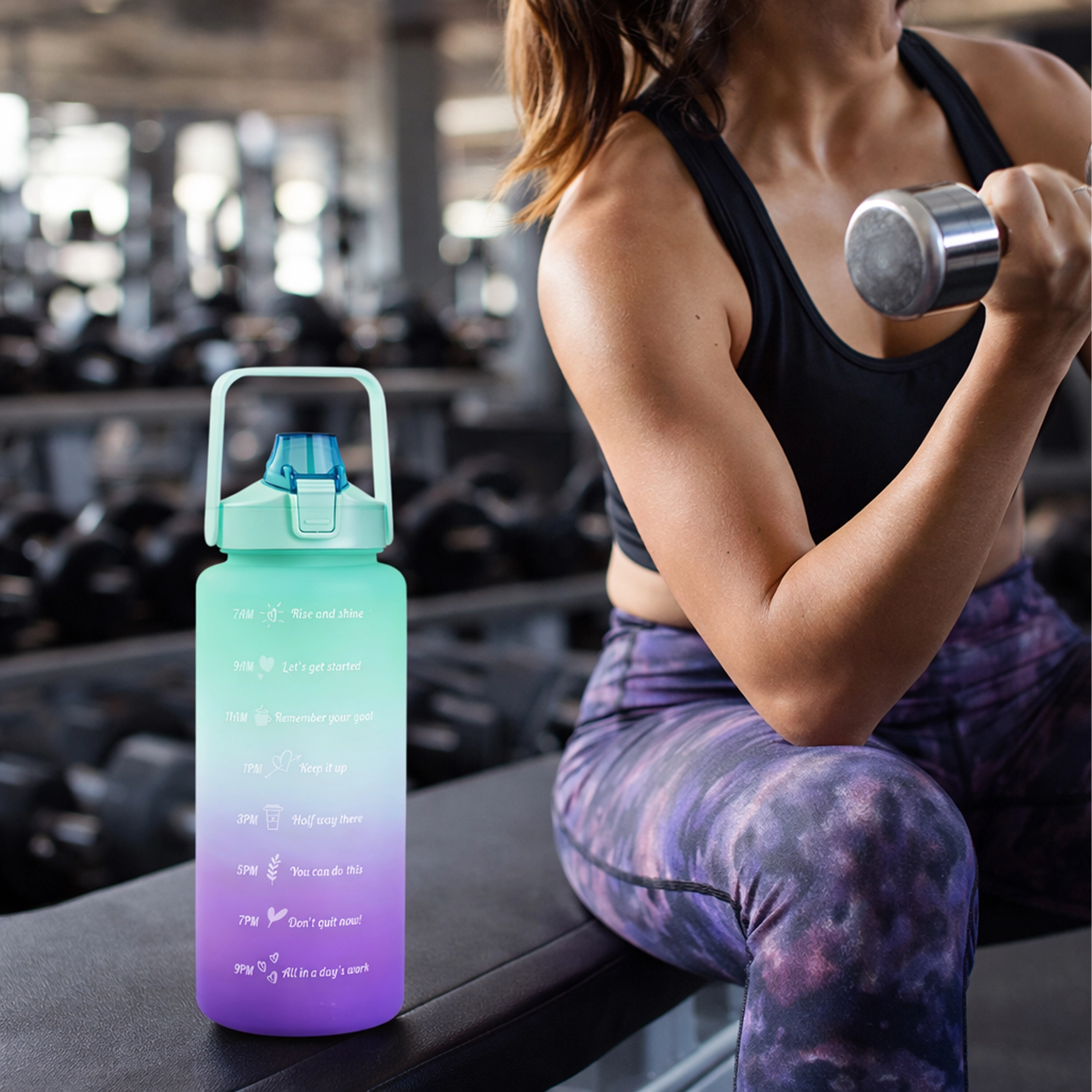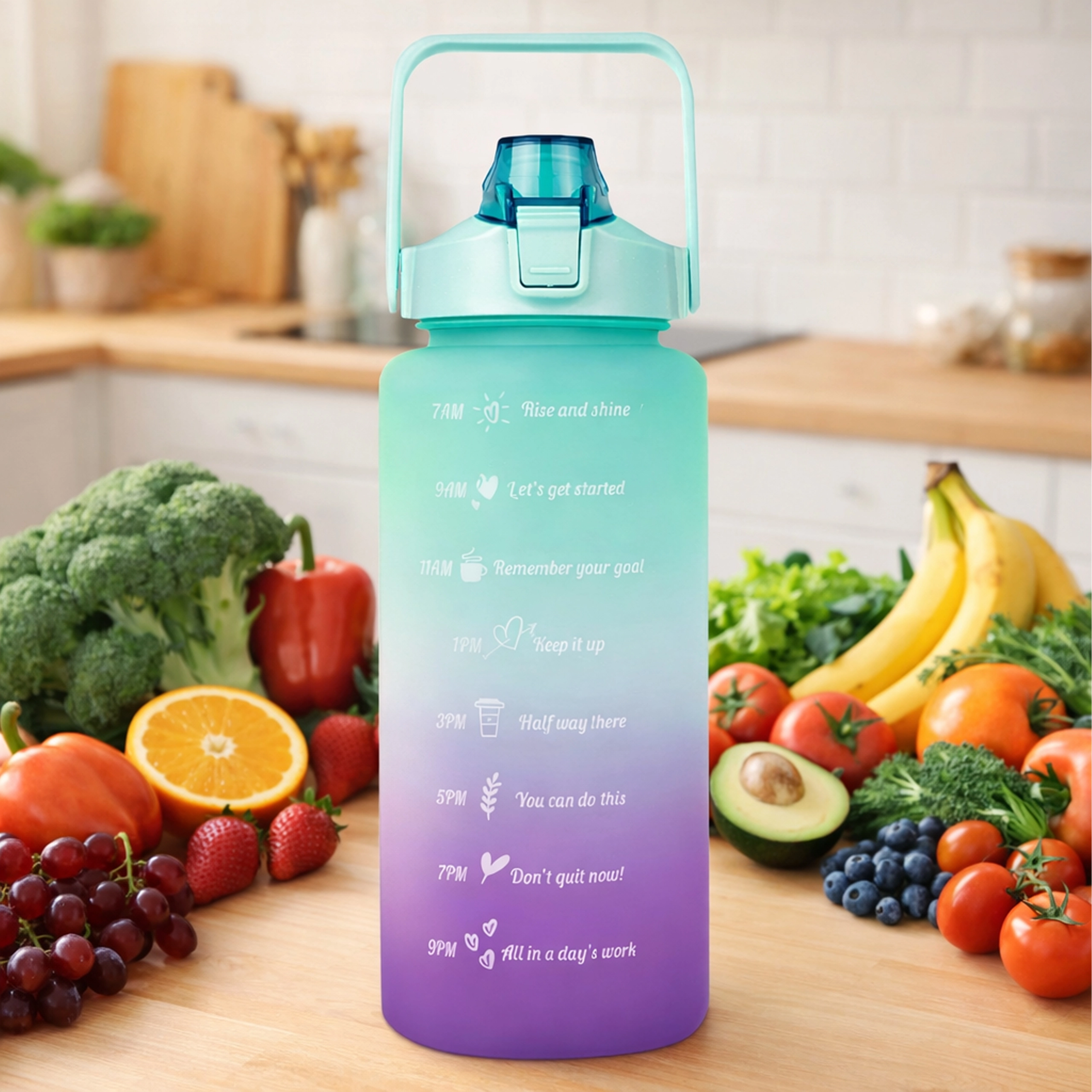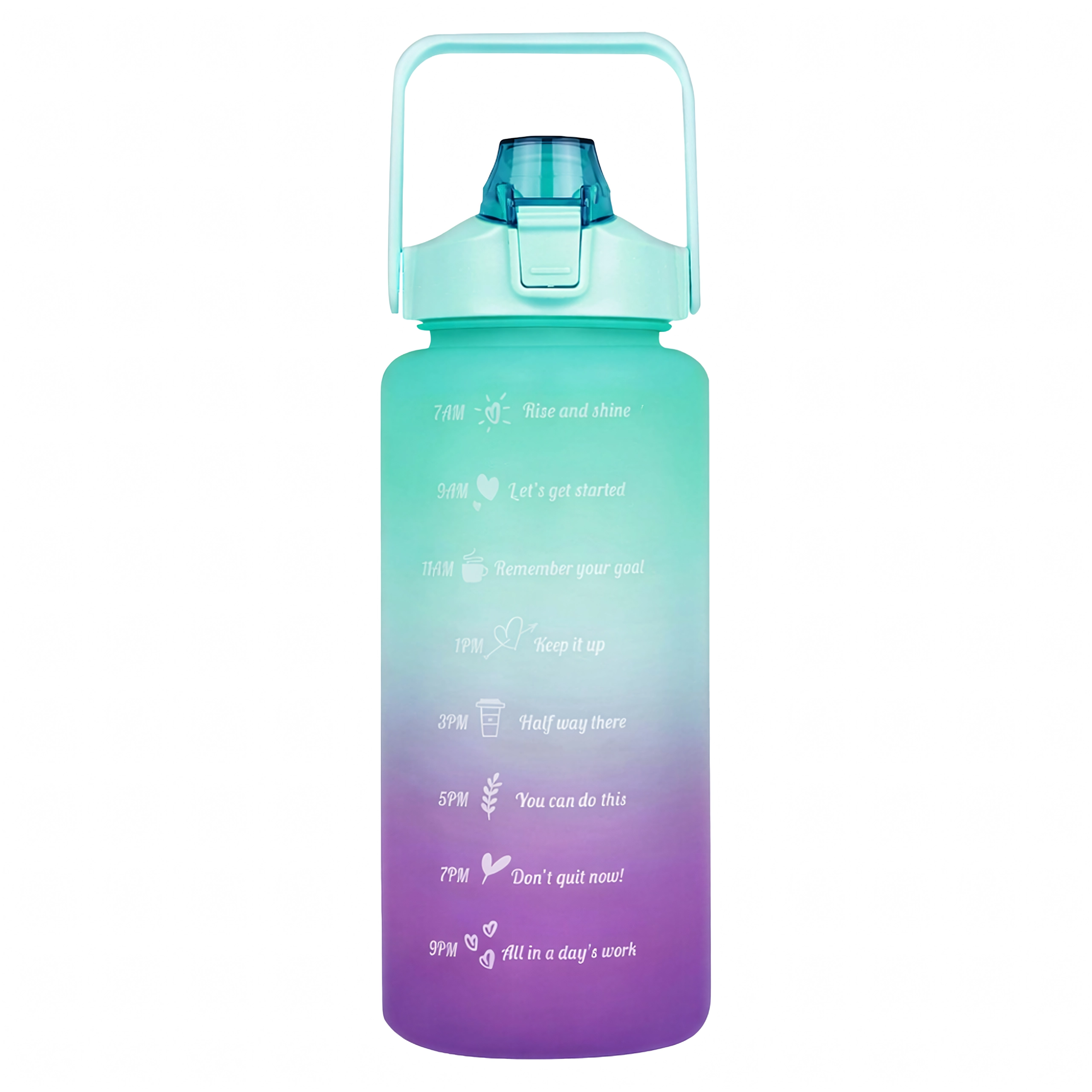 A nagy kapacitású, 2 literes motivációs vizespalack segít egyszerűen nyomon követni a napi folyadékbevitelt. A palackon áttekinthető időjelölések motiváló feliratokkal vezetnek reggeltől estig. A praktikus flip zár szívószállal gyors, kilöttyenésmentes ivást biztosít, a biztonsági zár pedig megóv a táskában történő véletlen kinyílástól.