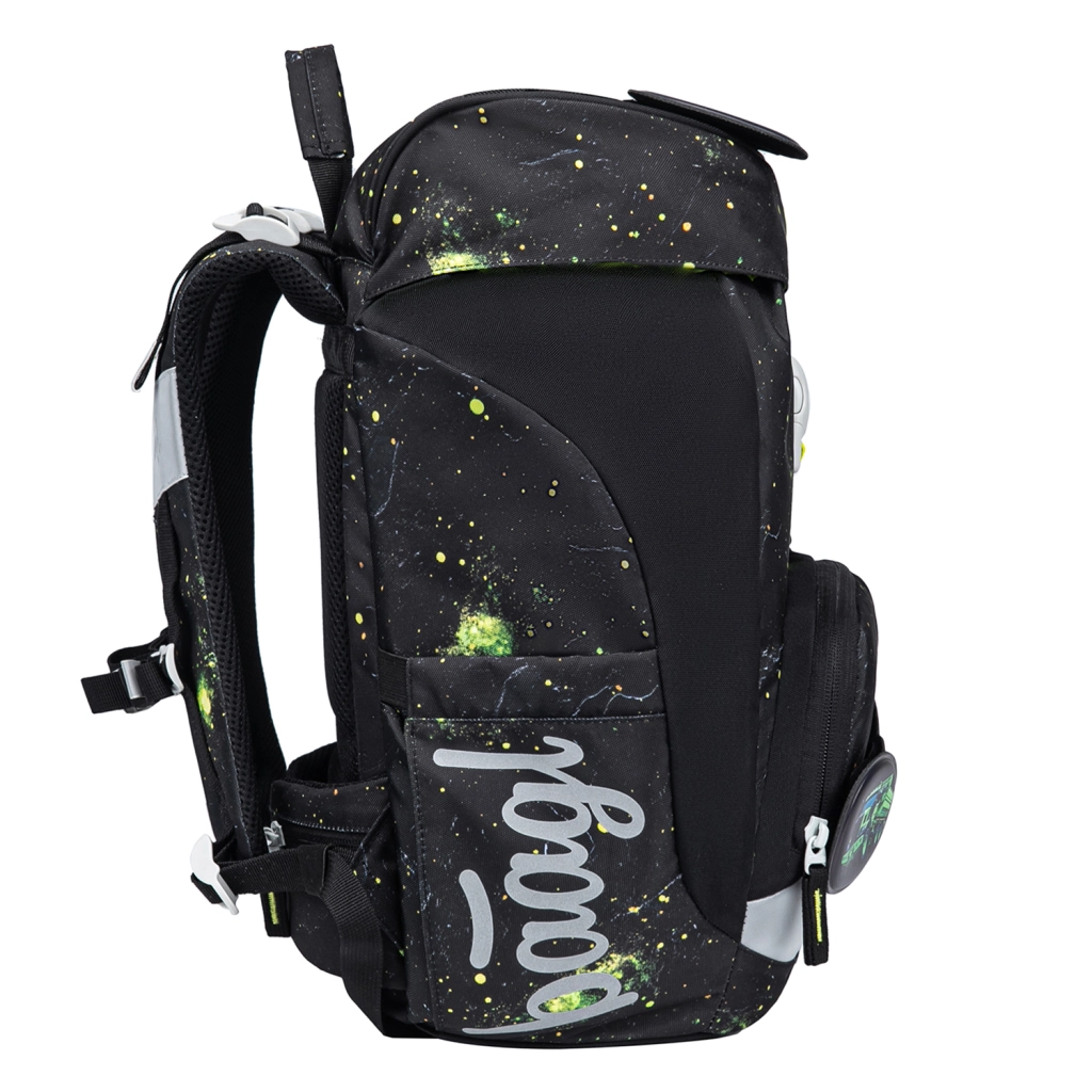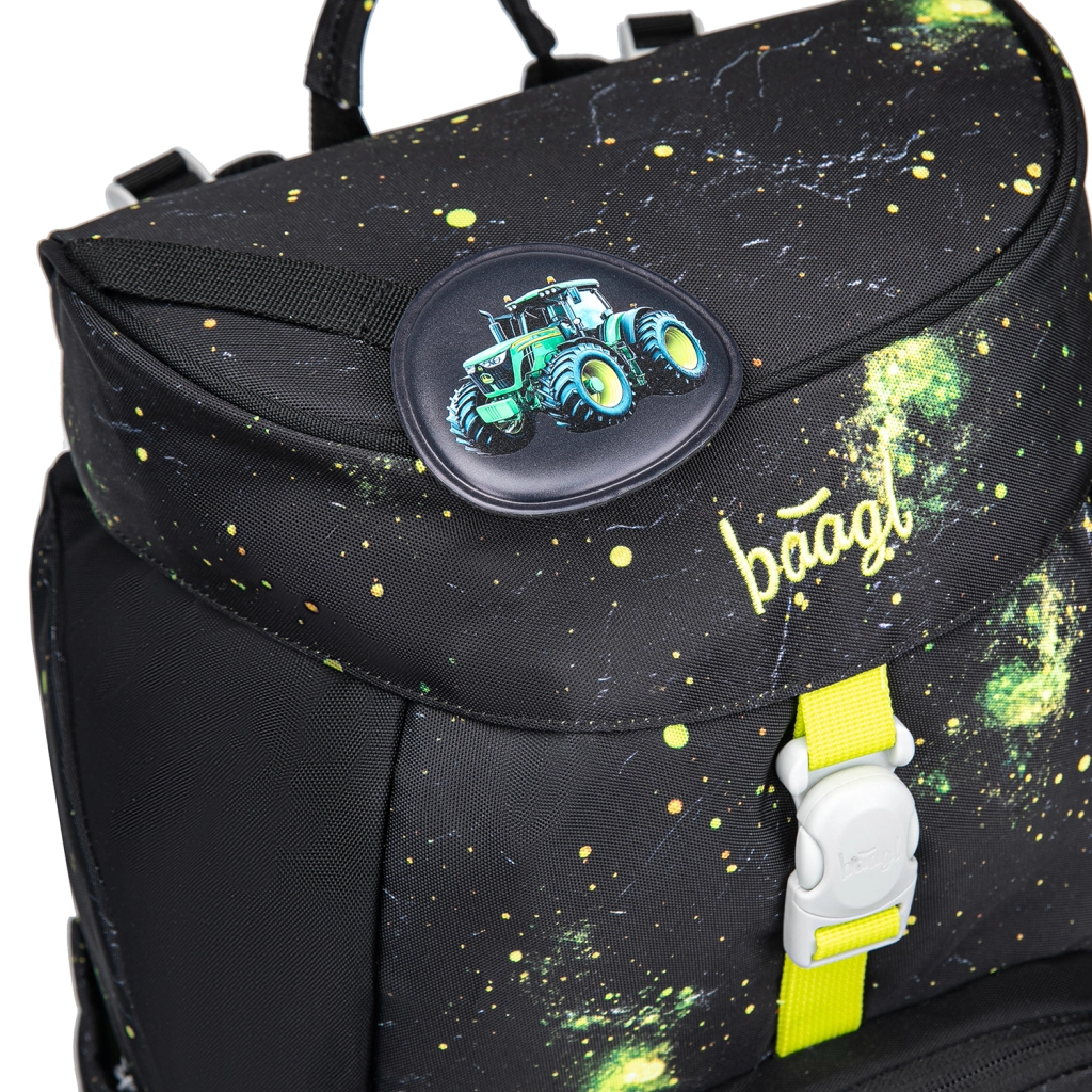 Praktikus, egyrekeszes belső elrendezés belső zsebbel és gumipánttal a mappák rögzítéséhez, amely megkönnyíti az iskolai felszerelés rendszerezését. A hátizsák újrahasznosított, vízálló anyagokból készül, feltűnő fényvisszaverő elemekkel a jobb láthatóság és biztonság érdekében. Az intuitív Magnetic Click zárat még az elsősök is könnyedén kezelik. A dizájn a levehető, traktor témájú kitűzőknek (patcheknek) köszönhetően egyszerűen variálható.