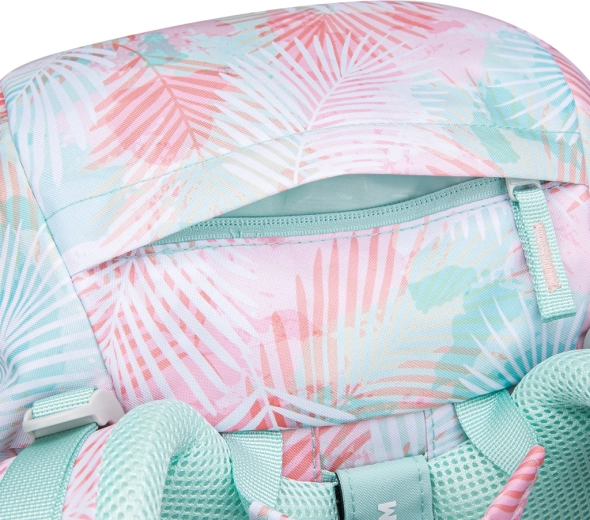 A praktikus belső elosztás része a rendszerezővel ellátott főrekesz, a könnyű védőlapok a füzetekhez, valamint az elülső termo zseb az uzsonnának, amely tovább frissen tartja az ételeket. A légáteresztő párnázás, az állítható vállpántok, a mellheveder és a levehető derékpánt stabilitást és egészséges testtartást támogat. A biztonságot a fényvisszaverő elemek növelik, a tartósságról pedig a vízlepergető, újrahasznosított anyag gondoskodik GRS tanúsítvánnyal.