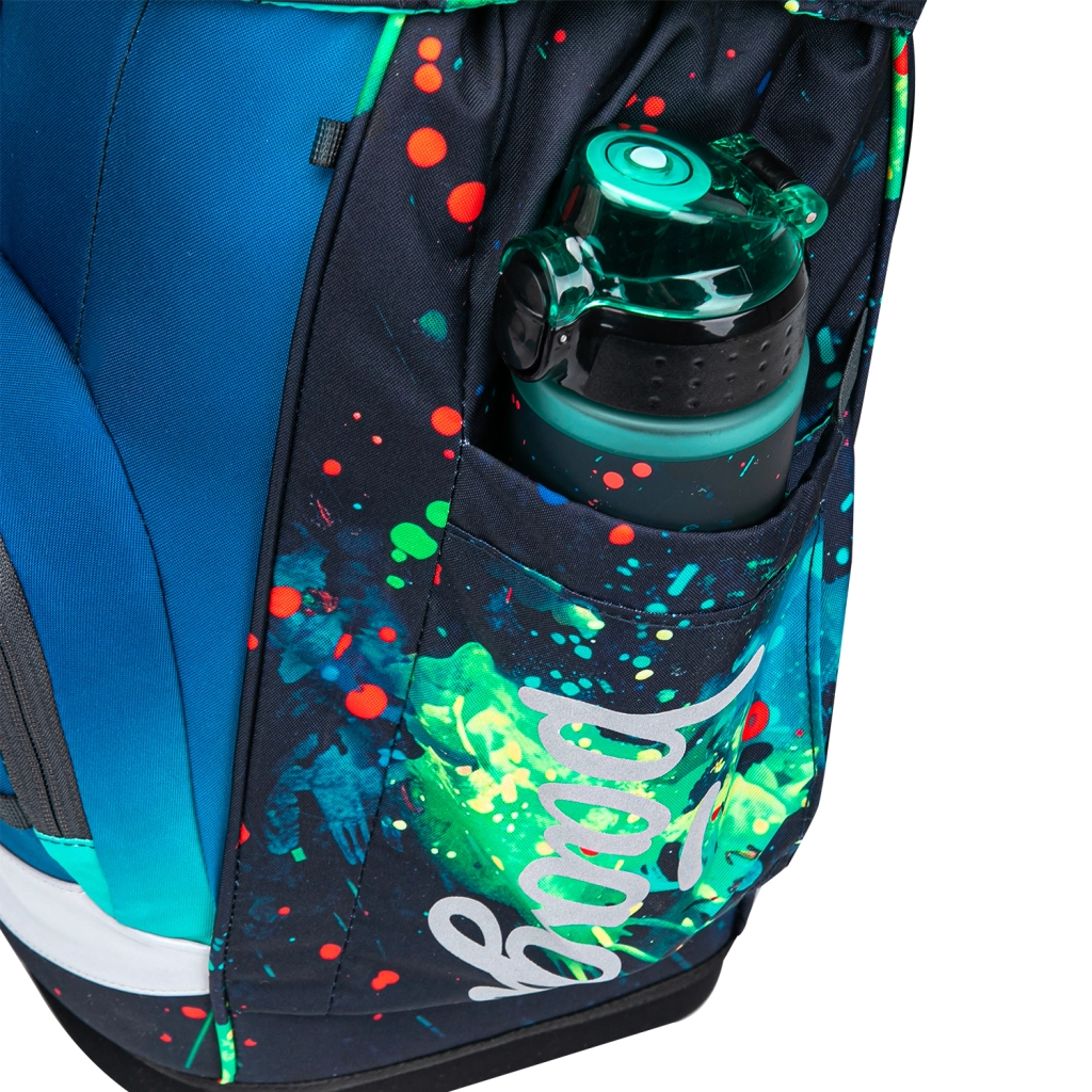 A praktikus felszereltséghez tartozik a főrekesz rendszerezővel, könnyű műanyag lapok a füzetek védelmére, elülső thermo zseb az uzsonnának, valamint a felső fedél mágneses záródással, amely magától rápattan. Az anyag újrahasznosított és vízálló, GRS tanúsítvánnyal és fényvisszaverő elemekkel kiegészítve. A vidám dizájn Baaglies cserélhető kitűzőkkel személyre szabható. A szett része egy egyszintes tolltartó minőségi YKK cipzárral, rögzítő gumikkal az írószereknek és órarend-ablakkal, valamint egy multifunkciós tornazsák elülső cipzáras zsebbel cipőnek vagy sportfelszerelésnek.