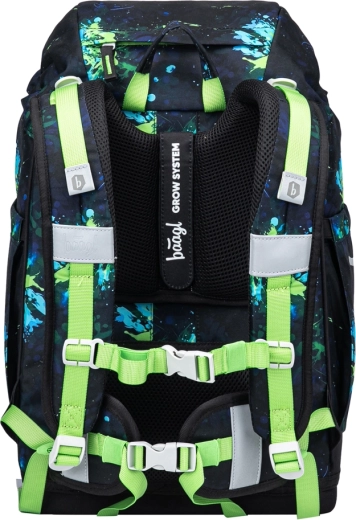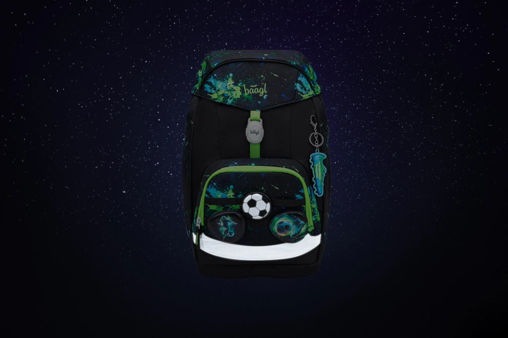 A belső tagolás főrekeszből áll rendszerezővel, a könnyű műanyag irattartó lapok pedig védik a füzeteket. Az elülső hőszigetelt zseb tovább frissen tartja az uzsonnát és meggátolja a szagok terjedését. Az anyagok újrahasznosítottak és vízlepergetők, a fényvisszaverő elemeknek köszönhetően pedig a biztonság kiemelt. A cserélhető kitűzőkkel (Baaglies) a gyerekek könnyen személyre szabhatják a hátizsákot. A szett része a tágas, egyszintes, két füllel ellátott tolltartó (töltet nélkül), a tornacipőhöz vagy szakköri felszereléshez való zsák karabinerrel a hátizsákra rögzítéshez, a praktikus kötény/átvető átöltözéshez vagy védelemhez és a nyakba akasztható pénztárca a zsebpénzhez és iratokhoz.