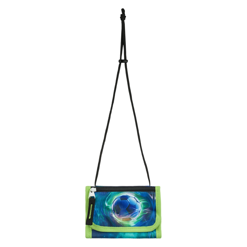 Nyakba akasztható pénztárca állítható zsinórral, amely megóvja a zsebpénzt és az iratokat. Cipzáras zseb és tépőzáras fedél, sportos focis dizájn, amely illik a szetthez.